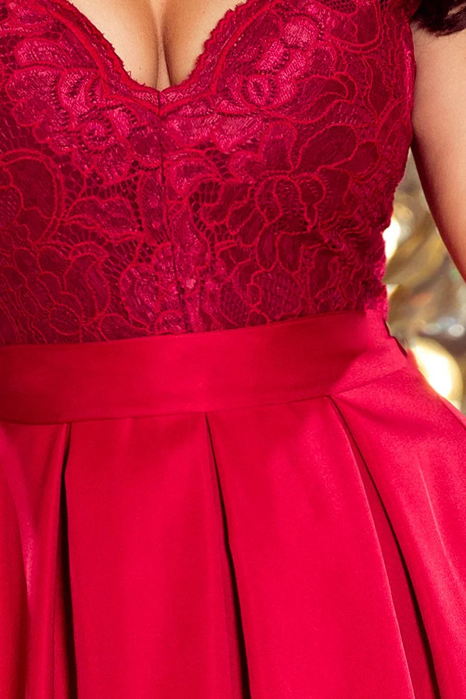 Dámske šaty 242-2 Numoco - krátke rukávy - výstrih do V - dĺžka šiat siaha nad kolená - sukňa má rozšírený strih - čipkovaný vrchný diel Materiálové zloženie: 95 % polyester + 5 % elastan Rozmery: S M L XL Dĺžka od podpazušia po podpazušie (A) 40 42 44 46 Pás (B) 34 36 38 40 Dĺžka od podpažia (D) 70 70 71 71 Dĺžka od ramena (E) 89 89 91 92