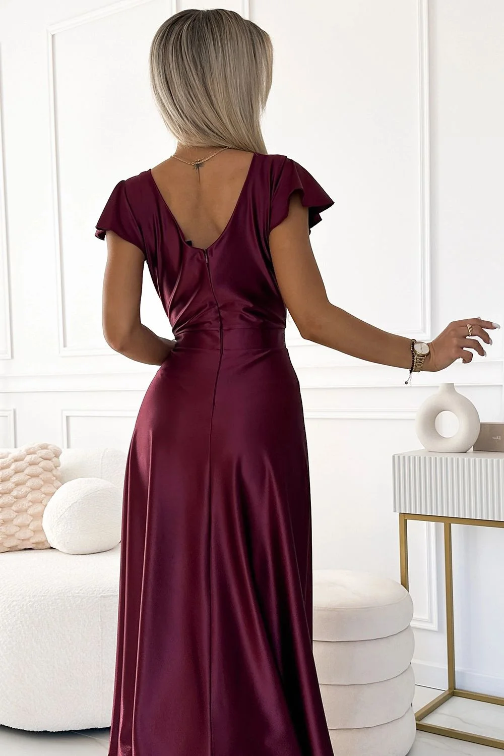 Dámske šaty 411-10 CRYSTAL NUMOCO - bordová farba - dlhé saténové šaty s výstrihom - krátke rukávy s volánmi - hlboký výstrih zdobený crisscrossom - dlhý rozparok - dĺžka po zem - vhodné na plesy - vzadu skrytý zips Zloženie materiálu: 95% polyester + 5% elastan
