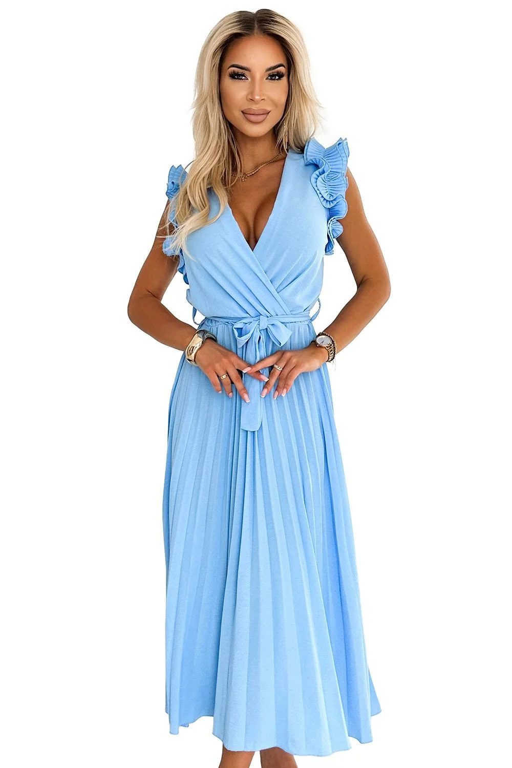 Dámske šaty 543-2 Numoco basic - modré - zo vzdušného materiálu - plisované šaty - lodičkový výstrih - široké ramienka zdobené volánmi - zapínanie na opasok Zloženie materiálu: 100% polyester