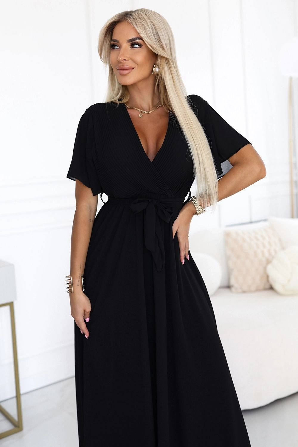 Dámske šaty 545-5 Numoco basic - čierne - šifón - krátke volánové rukávy - lodičkový výstrih - zaväzovanie v páseZloženie materiálu: 95% polyester+ 5% elastan