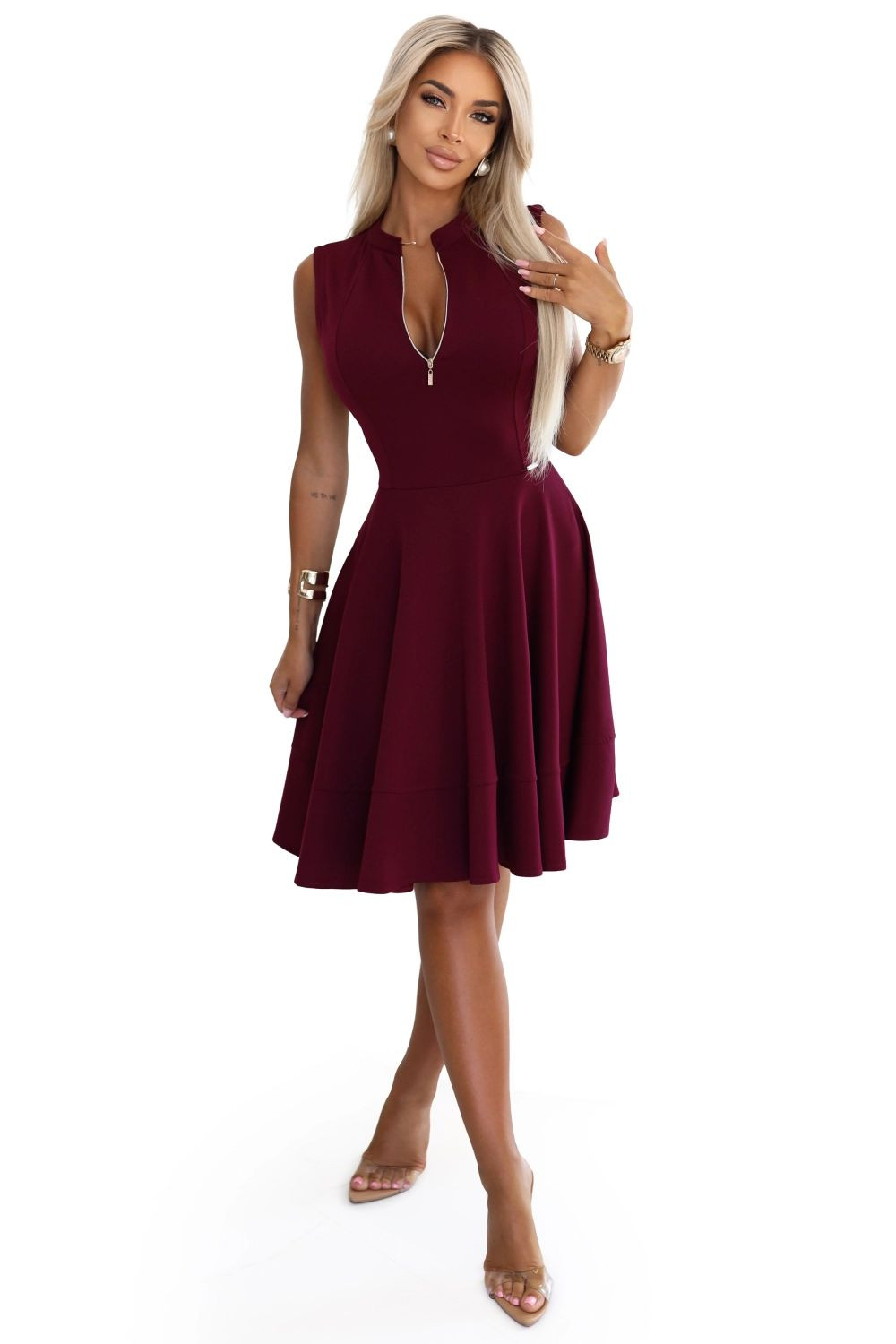 Dámske šaty 573-4 NUMOCO - bordová farba - vyrobené z elastickej hrubšej tkaniny - výstrih na zips - sukňa zakončená volánom - perfektne sediaZloženie materiálu: 90% polyester + 10% elastan