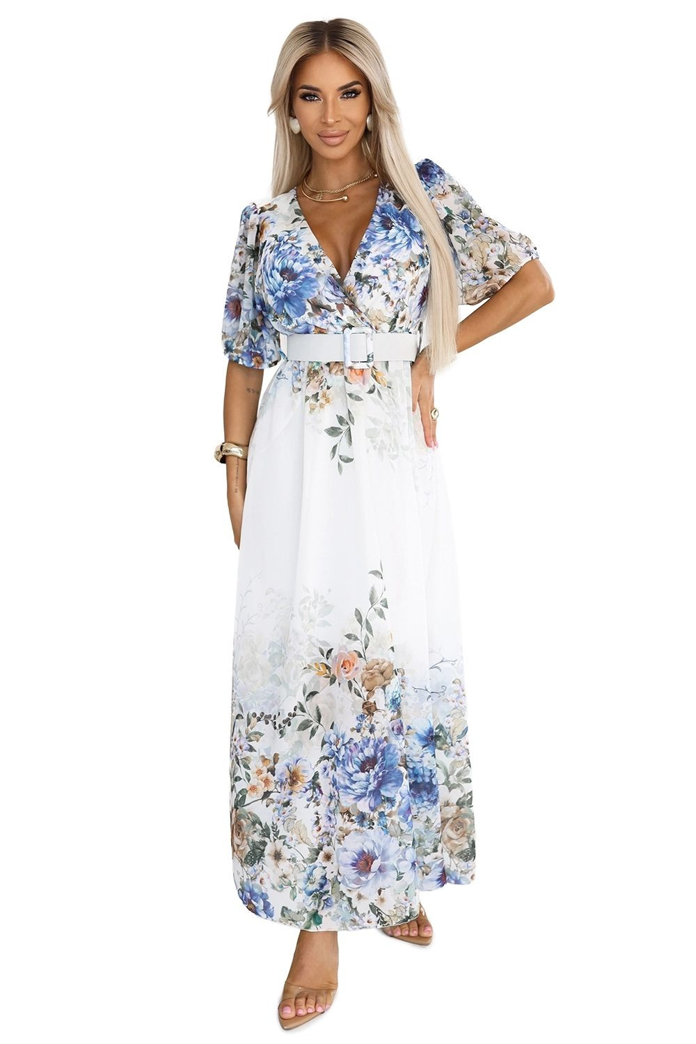 Dámske šaty 613-1 CELINA Numoco basic - biele - s farebnou kvetinovou potlačou - vyrobené zo vzdušného materiálu - zavinovací výstrih zvýrazňuje poprsie - krátke voľné rukávy - opasok v páse modeluje siluetu - maxi šaty s jemným ombré efektom - ideálne na leto, dovolenku, záhradnú párty alebo večeruZloženie materiálu: 95% polyester + 5% elastan