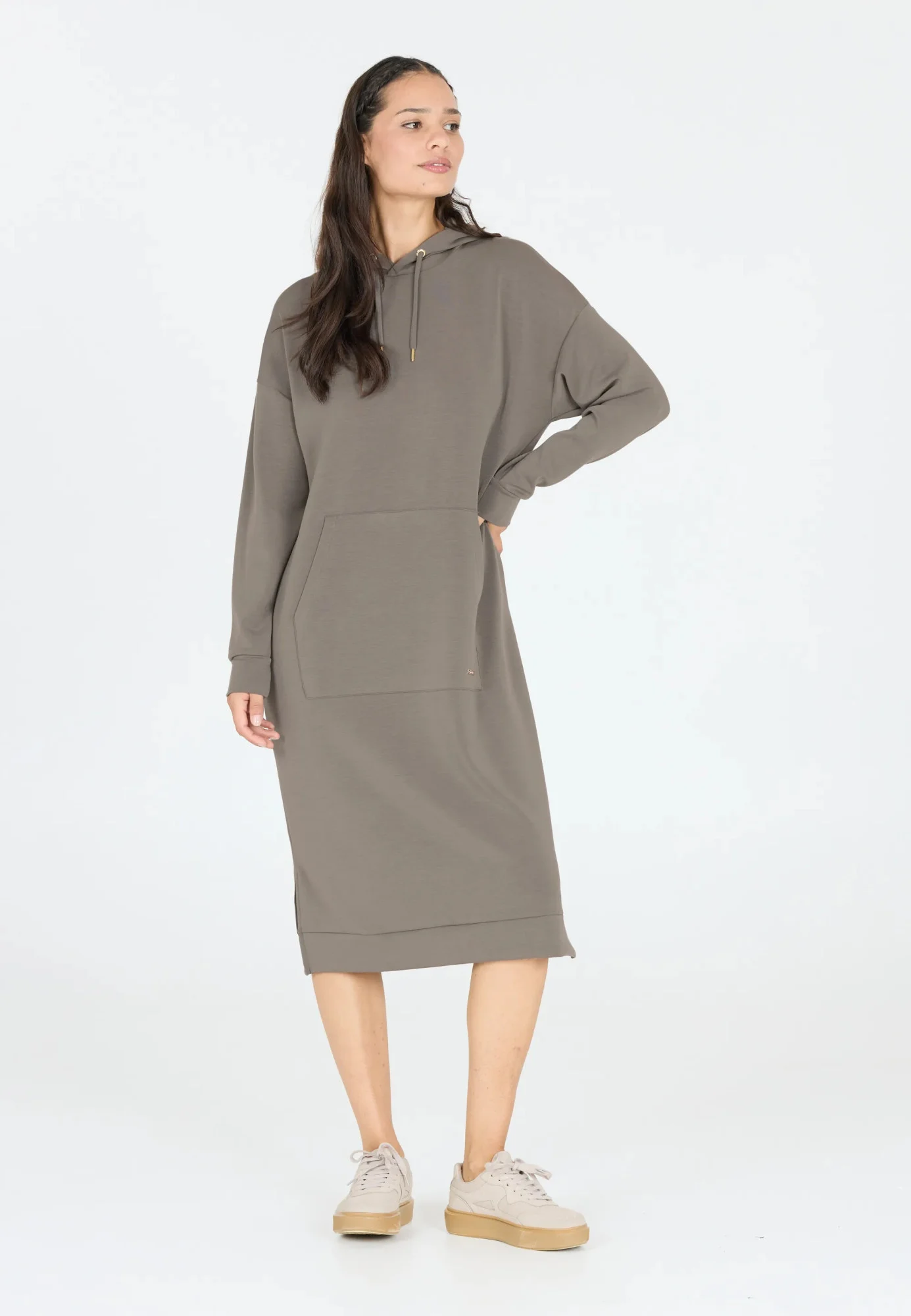 Štýlové dámske mikinové šaty v midi dĺžke sú skvelou voľbou pre pohodlný a moderný outfit. Sú vyrobené z mäkkého, príjemného materiálu, ktorý zaručuje pohodlie počas nosenia. Nadrozmerný strih s dlhými rukávmi a kapucňou dodáva šatám ležérny vzhľad, zatiaľ čo veľké klokanie vrecko v prednej časti dodáva šatám praktický prvok. Decentný kovový štítok s logom na vrecku podčiarkuje ich minimalistický štýl. Dokonalá kombinácia športového a elegantného vzhľadu - ideálne na každodenné nosenie s teniskami alebo štýlovými členkovými topánkami.
