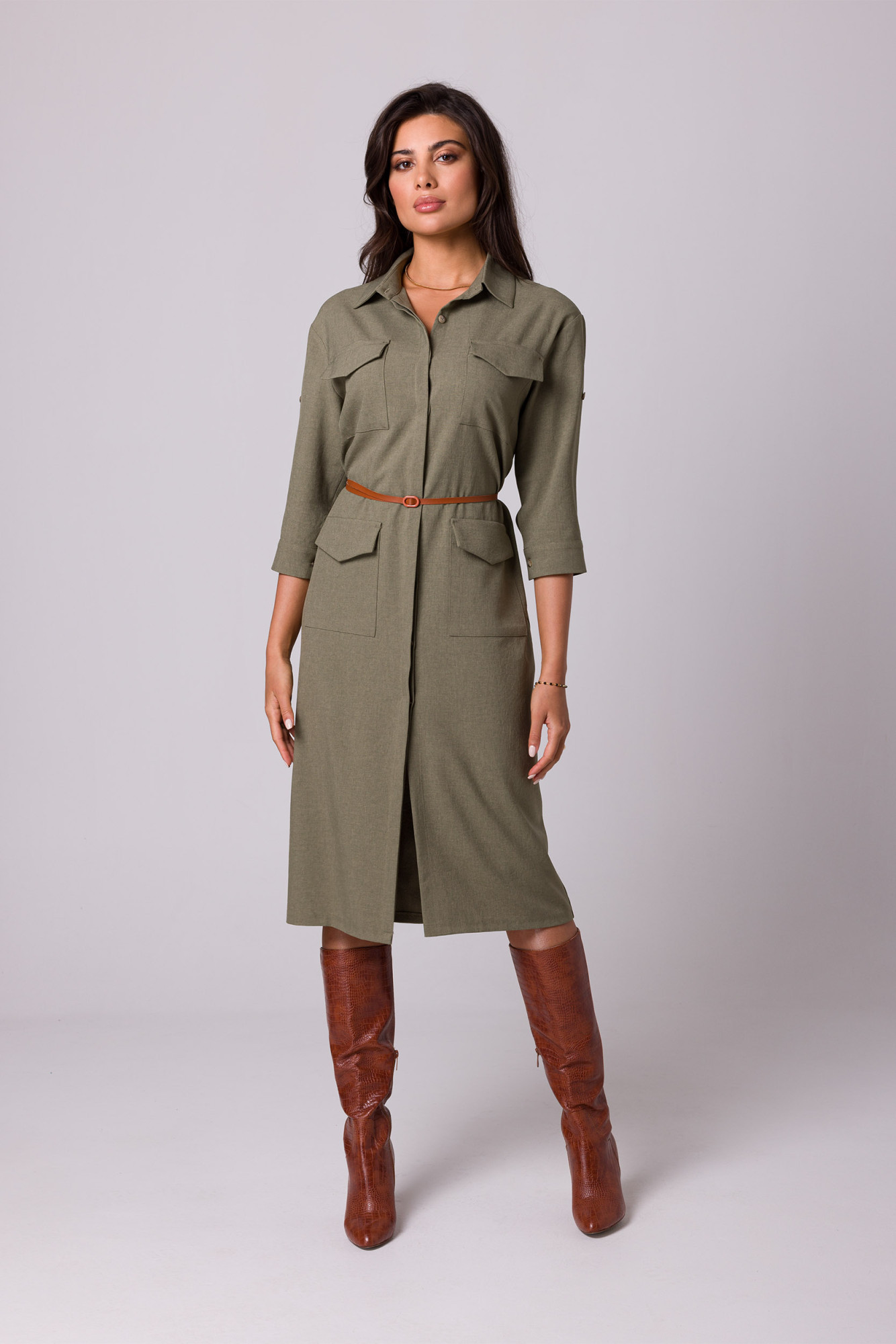 Košeľový dizajn s dvoma radmi vreciek s chlopňou, zapínaním na gombíky a opaskom so sponou - safari šaty, ktoré si zamilujete počas letných dní. 100 % polyester Kategória: Dámske oblečenie | Šaty | Midi šaty Pohlavie: Dámske Kolekcia jar/leto/jeseň/zima Pokyny na údržbu: Šaty sú vhodné na nosenie v šatníku Farba: olivová