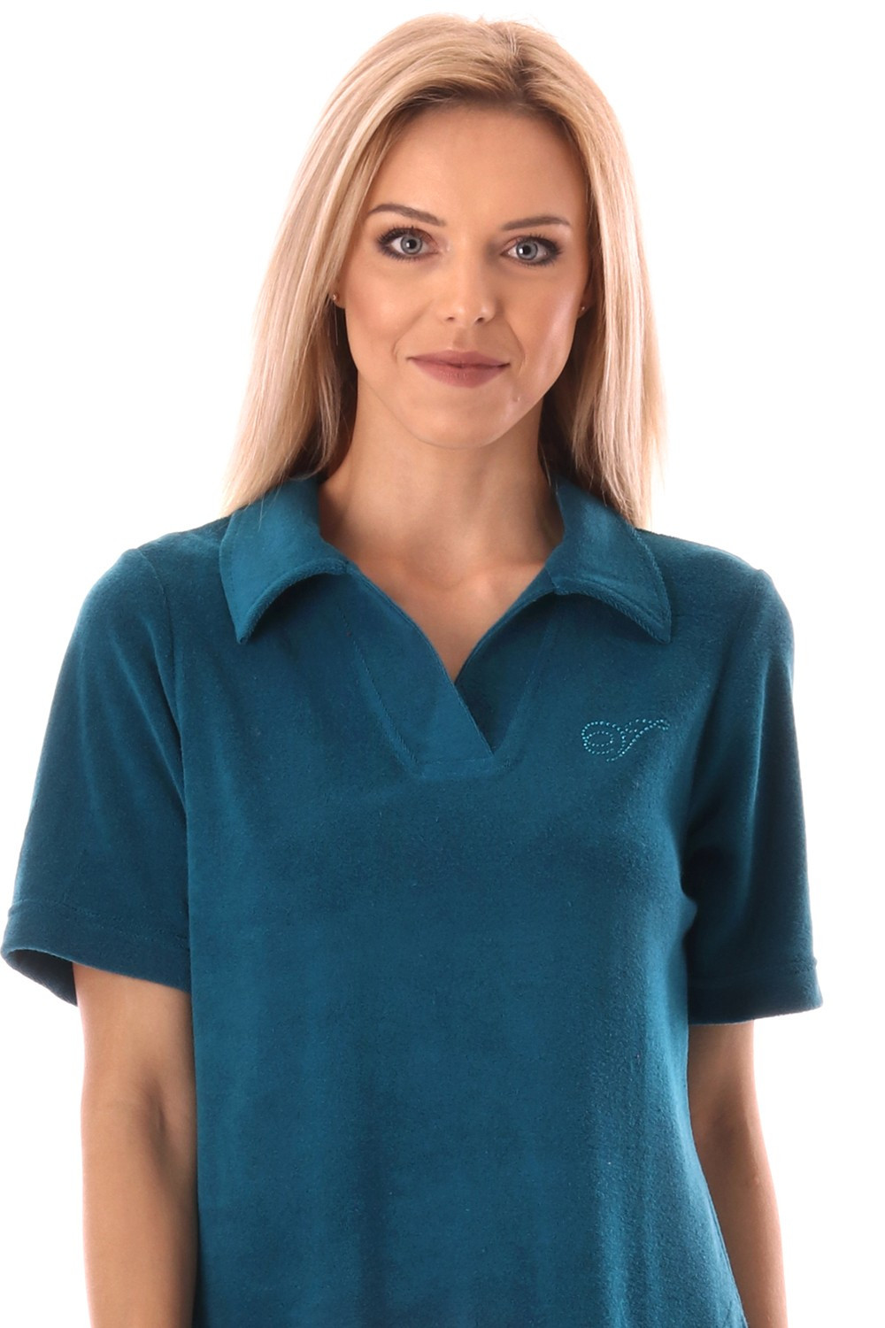Bari - ľahké froté domáce šaty s golierom mierne priliehavý strih s výstrihom do V a golierom dĺžka pod kolená, krátke rukávy ľahký pletený froté materiál 80 % bavlna 20 % polyester príjemný pocit vďaka elastickému materiálu vrecká v bočných švoch Tieto ľahké a pohodlné domáce šaty sú ideálnym spoločníkom na všetky vaše domáce aktivity. Materiál je elastický a umožňuje voľný pohyb, golier dodáva šatám športový vzhľad.