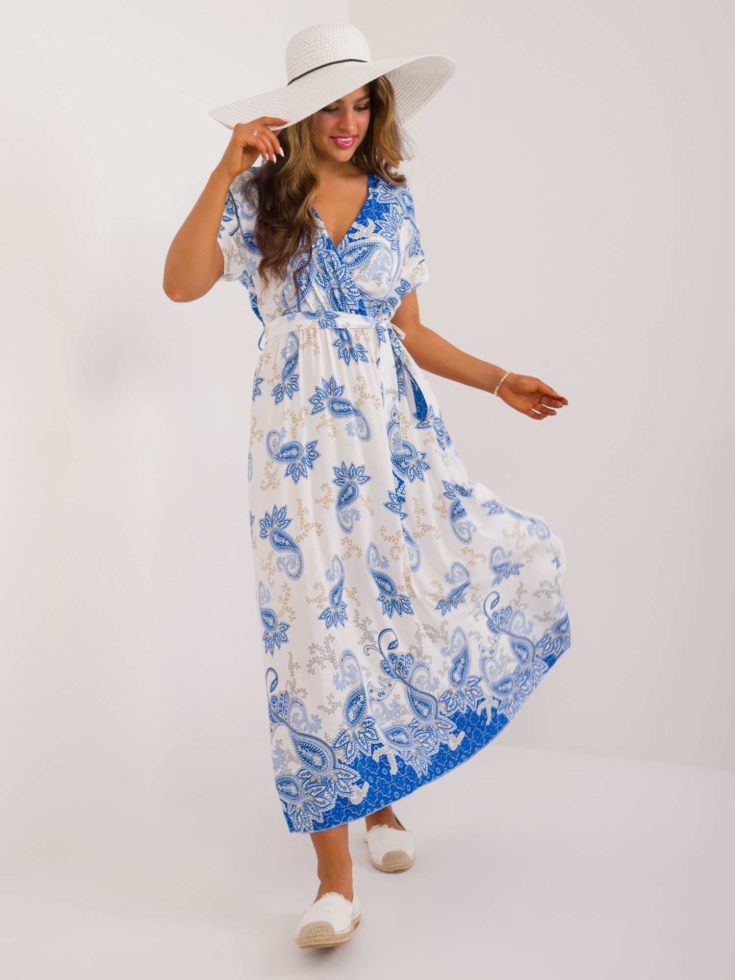Modelka má na sebe veľkosť one Rozmery modelky: výška 173 cm, prsia 90 cm, pás 64 cm, boky 91 cm. Rozmery šiat vo veľkosti 1 merané na plocho: šírka v podpazuší - 52 cm, celková dĺžka - 142 cm.