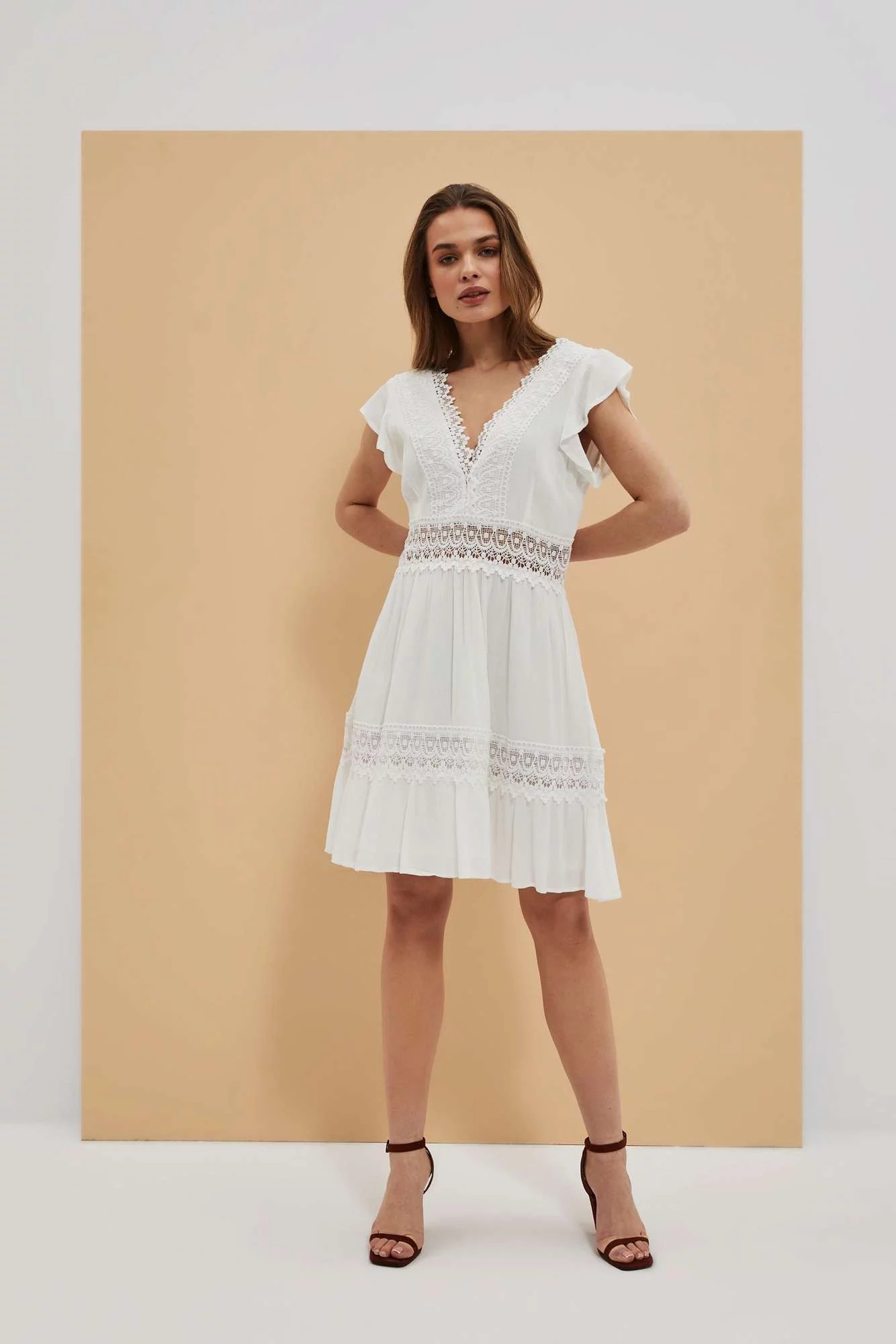Biele šaty. hladký materiál, bez vzorov. krátke volánové rukávy. výstrih do V, zdobený čipkou. vyrobené z viskózy, ľahký materiál, zdobený čipkou. zapínanie na zips pre ľahké obliekanie. navyše majú podšívku. rozšírený strih, mierne rozšírené smerom nadol. dĺžka nad kolená. ideálna voľba na špeciálne príležitosti a významné udalosti. 100 % VISKÓZA