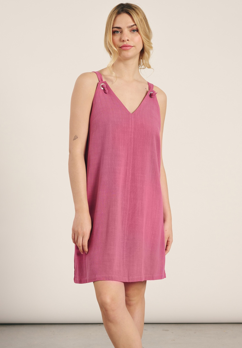 Dámske plážové šaty značky Muydemi. Šaty sú vyrobené z ľanu a viskózy, ideálne na horúce letné dni. Šaty sú voľné, jednoduchého strihu s dĺžkou nad kolená. Výstrih je v tvare V. Zloženie materiálu: 30 % ľan, 70 % viskóza.