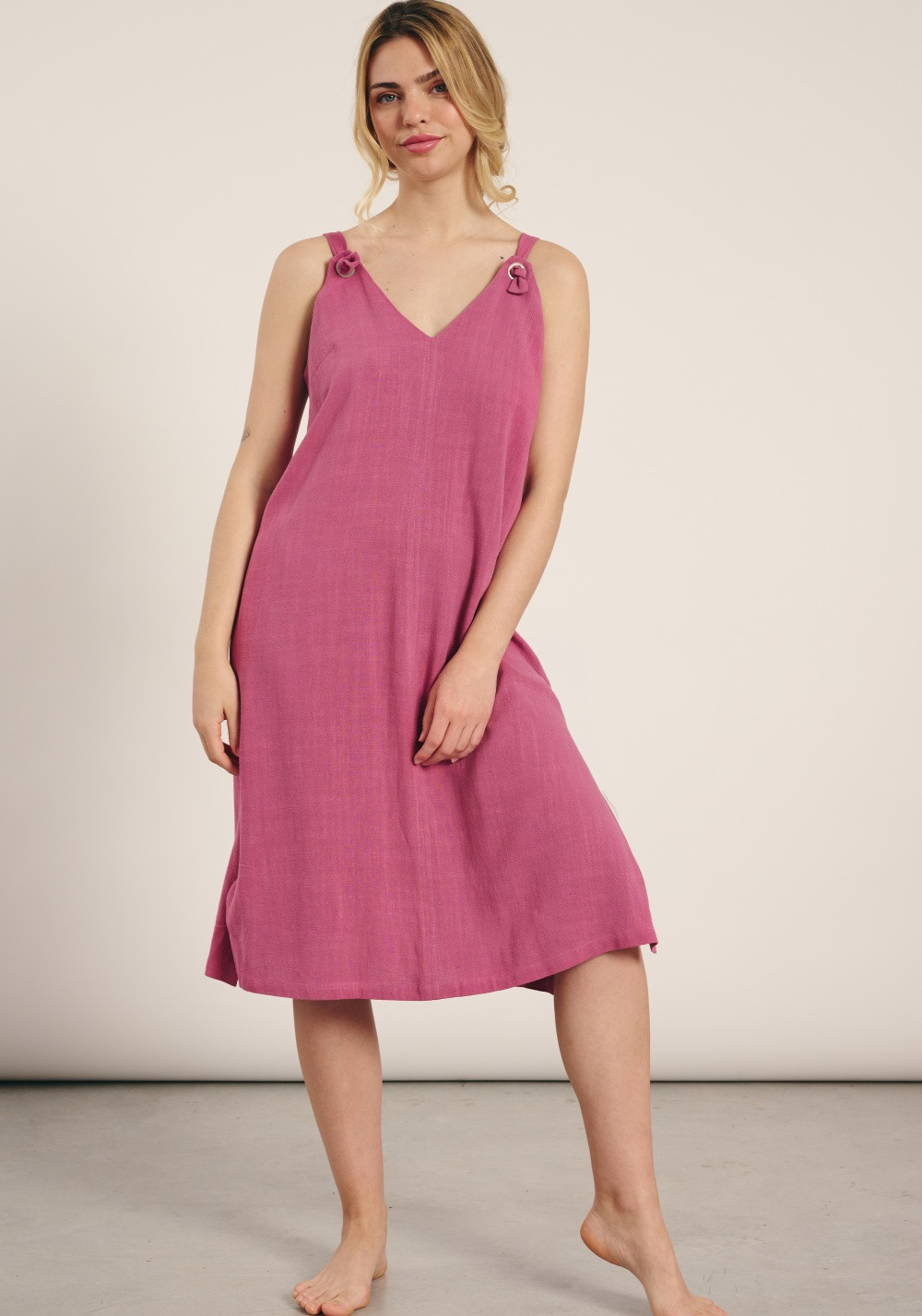 Dámske plážové šaty značky Muydemi. Šaty sú vyrobené z ľanu a viskózy, ideálne na horúce letné dni. Šaty majú voľný, jednoduchý strih s dĺžkou pod kolená. Výstrih je v tvare písmena V. Šaty majú širšie ramienka a rozparky na bokoch. Zloženie materiálu: 30 % ľan, 70 % viskóza.