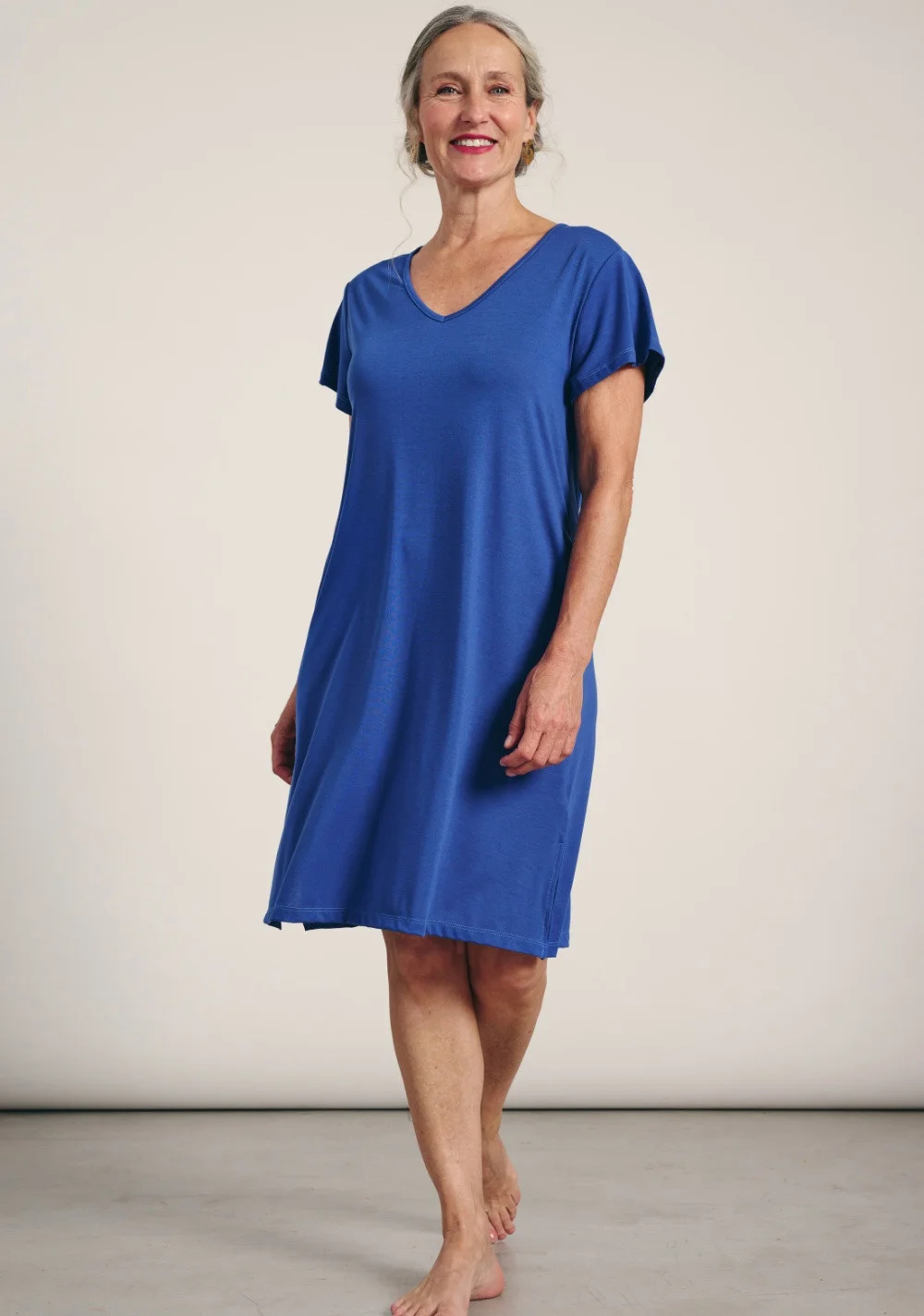 Dámske plážové šaty značky Muydemi vyrobené z veľmi jemného polyesteru. Šaty sú voľného strihu, jednoduché, s dĺžkou nad kolená, krátkymi rukávmi a výstrihom do V. Zloženie materiálu: 95 % polyester, 5 % elastan.