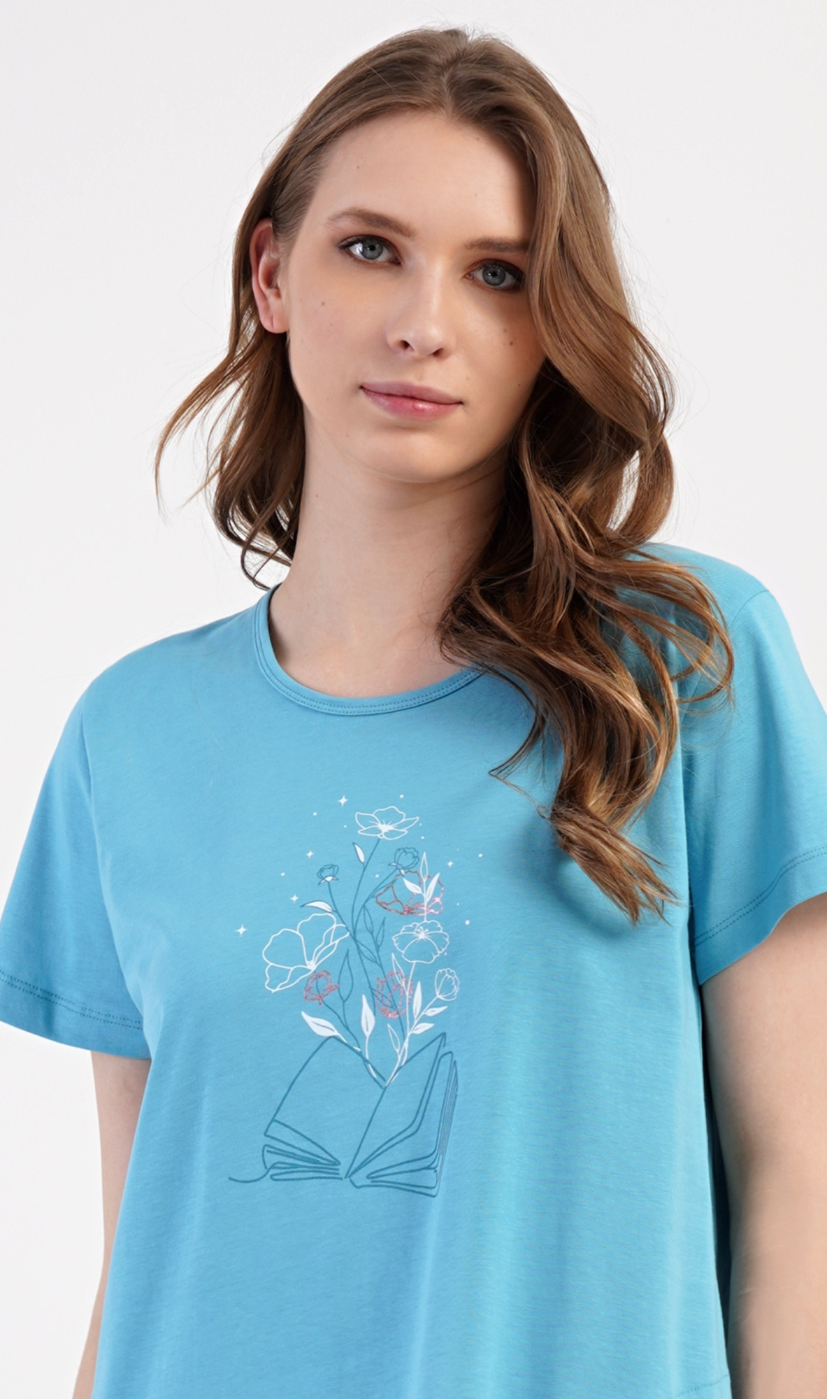 Dámské bavlněné domácí šaty s krátkým rukávem Book. Domácí jednobarevné šaty s kulatým výstřihem a kapsami zdobí na hrudi obrázek knihy a květů. Použitý bavlněný materiál je příjemný a poddajný na dotek. Šaty jsou pohodlné, vhodné na spaní i na denní nošení. Pokyny pro údržbu: - 100% bavlna- lze prát v pračce při teplotě do 30°- nesušit v sušičce- žehlit z rubu do 110°- nepoužívat bělící prostředky- nečistit chemicky Míry naměřené na výrobku: 4100630000 Book 1XL 2XL 3XL 4XL obvod hrudníku 118 124 130 134 obvod boky 124 130 136 140 délka 95 95 96 97