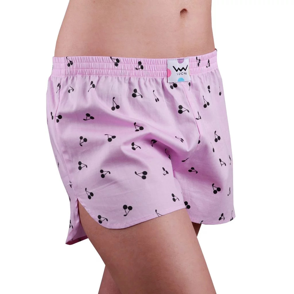 "Dokonale vyhriata posteľ, kniha, voňavá káva, čokoláda a nebezpečne pohodlné a roztomilé šortky. Znie vám to ako vysnívané víkendové ráno? Potom nečakajte a splňte si tento sen s týmito rozkošnými ružovými dámskymi šortkami s čerešňami." Originálne dámske šortky Vuch Na obrázku veľkosť M Materiál 100 % bavlna Praktický elastický pás