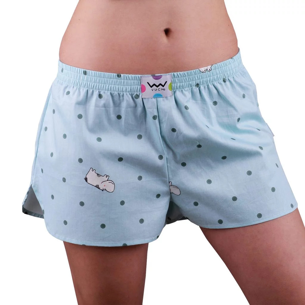 "Načo vstávať, keď si ešte môžete pospať? Zachumlajte sa do teplých prikrývok v návykovo pohodlných dámskych šortkách v modrej farbe s bodkami. Musíme vás však varovať, že keď si ich oblečiete, nebudete chcieť nosiť nič iné." Originálne dámske šortky Vuch Na obrázku veľkosť M Materiál 100 % bavlna Praktický elastický pás