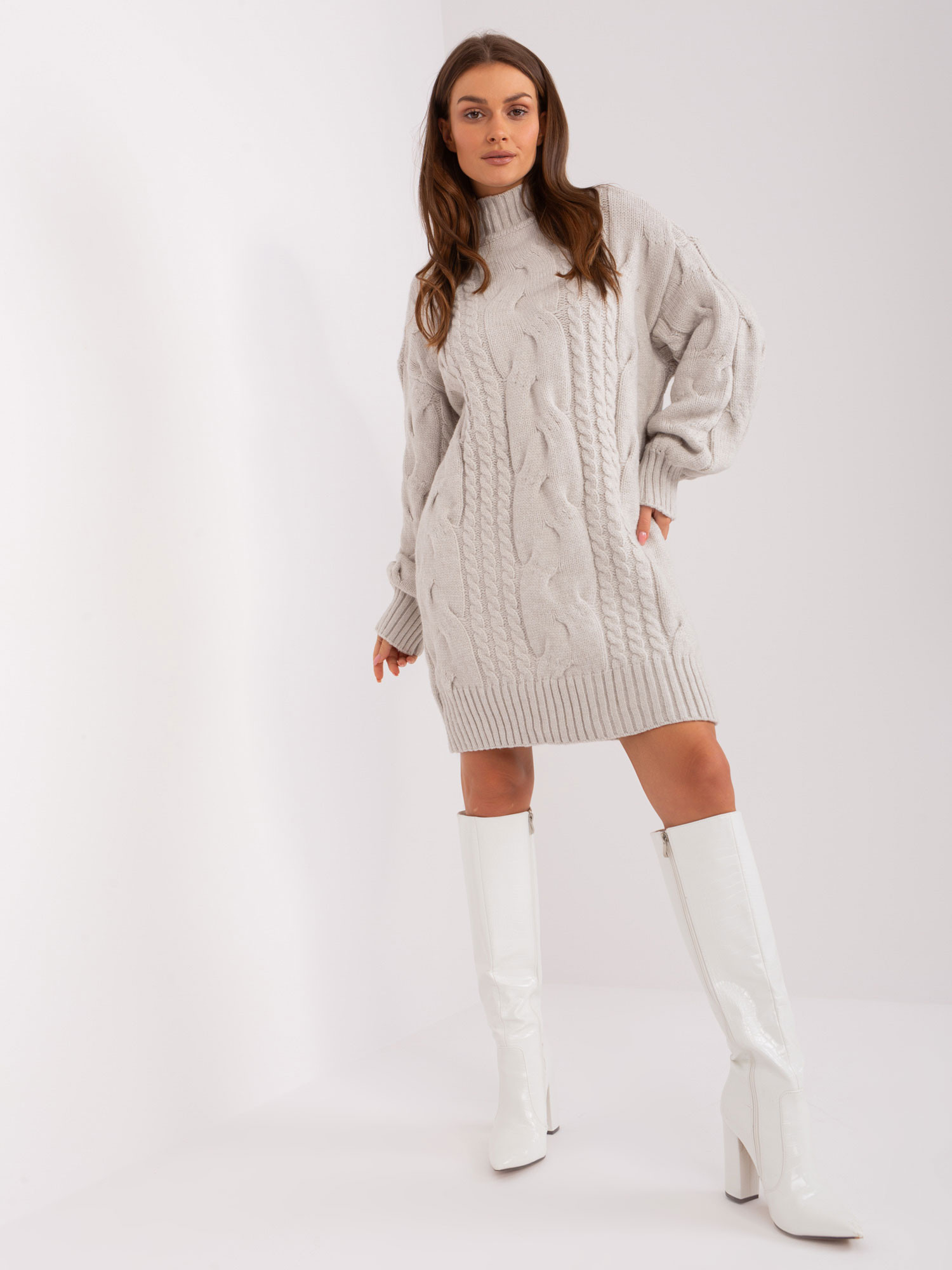 Svetlo béžové oversize pletené šaty. kód produktu: AT-SW-2367-1.35P dominantný vzor: rôznorodá textúra tkaniny štýl: ležérny príležitosť: na bežné nosenie, do práce, na prechádzku, do mesta Modelka má na sebe jednu veľkosť. Rozmery modelky: výška 170 cm, prsia 93 cm, pás 66 cm, boky 93 cm. Rozmery šiat v jednej veľkosti merané na plocho: šírka v podpazuší - 65 cm, dĺžka rukávu - 68 cm, celková dĺžka - 90 cm.