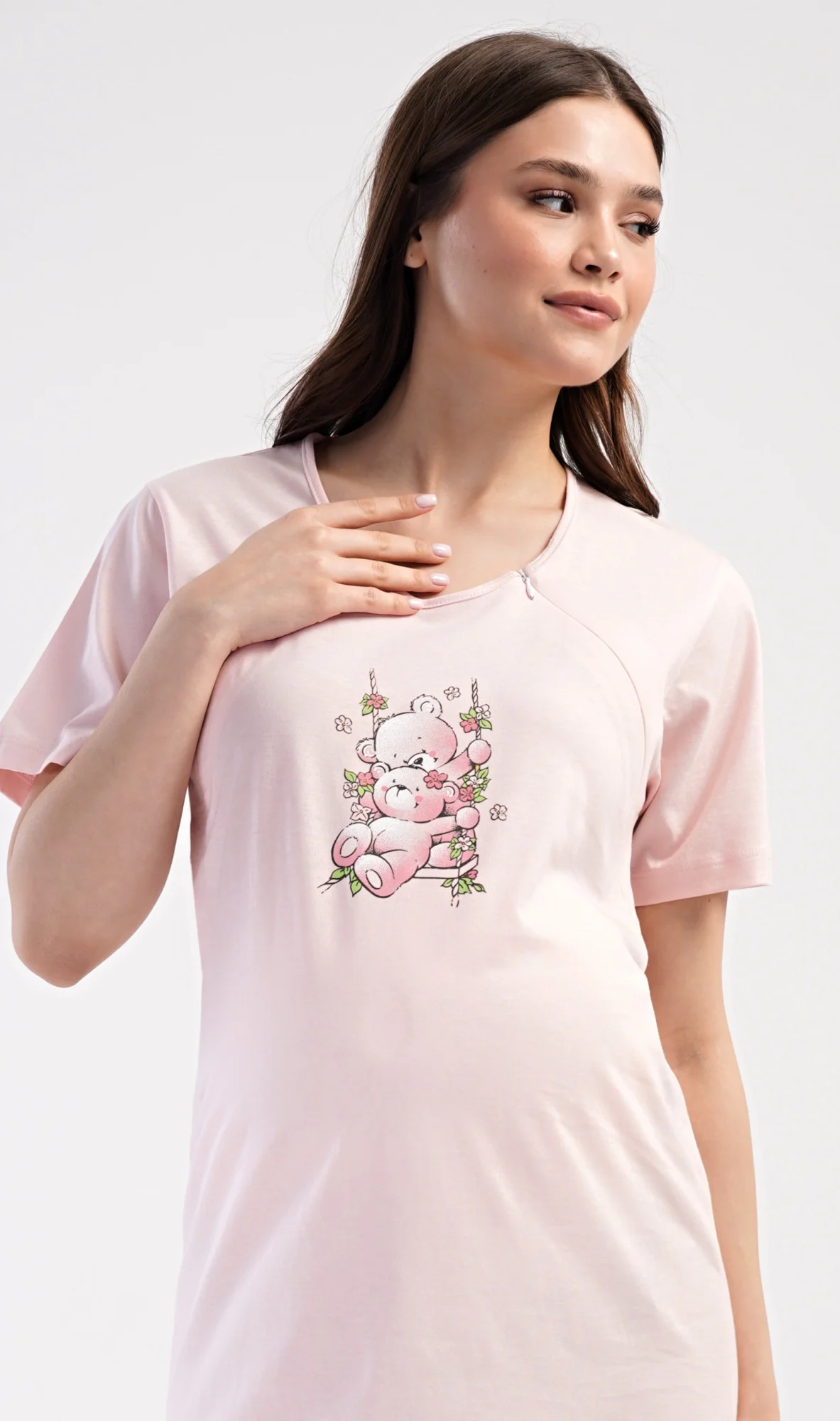 Dámská bavlněná mateřská noční košile Medvídci. Noční košile je svým střihem určená na dobu těhotenství, do porodnice i ke kojení. Ke kojení slouží průstřihy po stranách košile, které jsou uzavíratelné na zip. Přední díl košile zdobí obrázek medvídků na houpačce. Použitý materiál s podílem bavlny 100% je příjemný a poddajný na dotek. Pokyny pro údržbu: -100 % bavlna- lze prát v pračce při teplotě do 30°- nesušit v sušičce- žehlit z rubu do 110°- nepoužívat bělící prostředky- nečistit chemicky Míry naměřené na výrobku: 4101370000 Medvídci S M L XL obvod hrudníku 94 98 106 110 obvod boky 98 104 110 116 délka 96 97 98 99