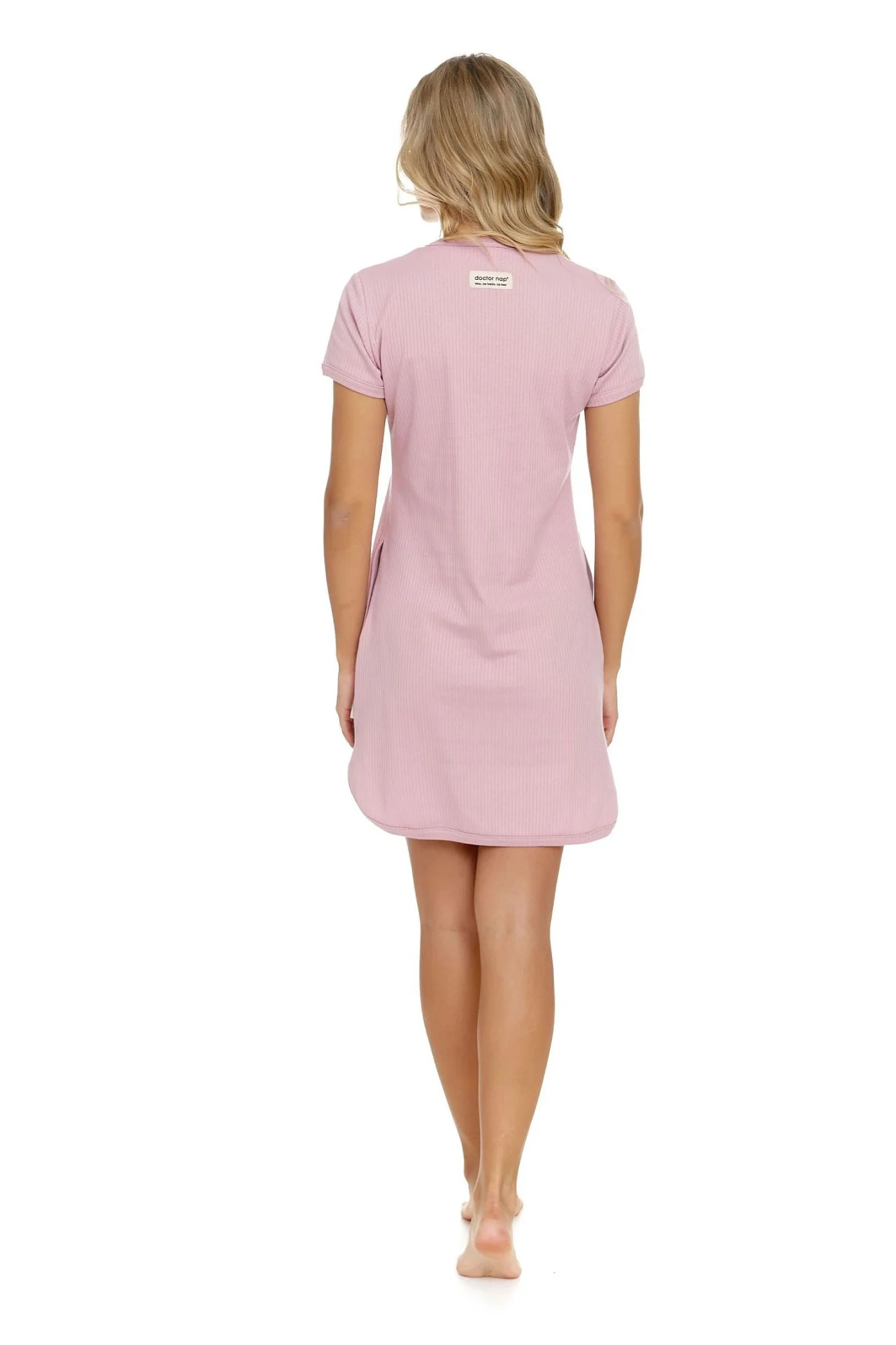 Dámske tehotenské tričko 4542 Doctornap - svetlo fialové - vyrobené z kvalitnej rebrovanej bavlny - krátke rukávy - zapínanie na patentky - vrecká na bokoch - spodná časť zakončená volánom - ideálne pre tehotné a dojčiace ženy - hypoalergénne - certifikát OEKO-TEX Standard 100 Zloženie materiálu: 100% bavlna