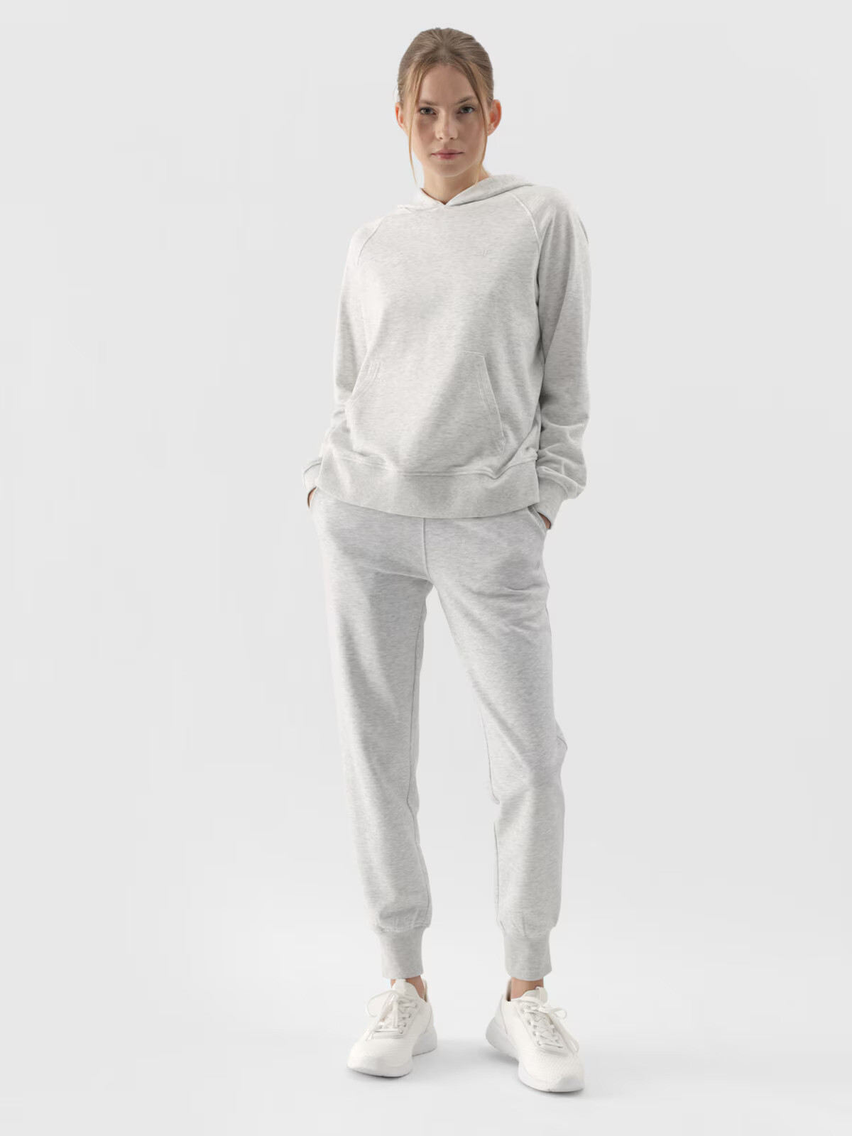 Dámske tepláky typu jogger sú ideálne na bežné aj športové každodenné štylizácie. Majú regular strih, ktorý sa pohodlne prispôsobí postave, a zúžené nohavice zakončené elastickým lemom. Vďaka jednoduchej džersejovej väzbe s hladkou úpravou na jednej strane sú elastické a príjemne sa nosia. Dámske tepláky sú vyrobené zo stredne hrubého úpletu s gramážou 280 g/m², vďaka čomu sú mäkké a priedušné. Dámske bavlnené tepláky sú vyrobené zo 78 % z bavlny, vďaka čomu sú mäkké, odolné a príjemné na dotyk. Vďaka prídavku polyesteru (20 %) si materiál zachováva svoj strih a je odolný voči opotrebovaniu počas mnohých sezón. Česaná vnútorná strana zabezpečuje väčšiu hrejivosť, takže nohavice sú ideálnou voľbou na chladnejšie dni. Na bokoch sú 2 otvorené vrecká. Elastický pás s vnútorným nastavením na šnúrku.