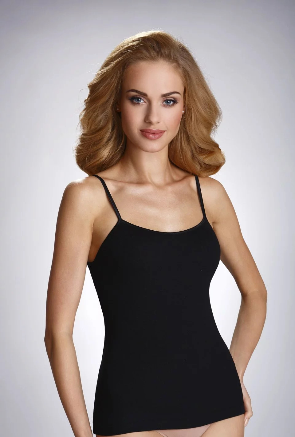 Jemná, hladká blúzka s tenkými ramienkami, vyrobená z mäkkej bavlny, ktorá je príjemná na dotyk. Je vhodná na každodenné nosenie aj ako domáce oblečenie. V šortkovej verzii z nej bude skvelé pyžamo. Môžete ju nosiť aj pod mierne priesvitnú blúzku - okamžite zvýši úroveň pohodlia bez toho, aby ste stratili krásny a elegantný vzhľad. Zloženie: 100 % bavlna. Veľkosť S M L XL XXL XXXL Obvod poprsia 84-88 cm 92-96 cm 100-104 cm 108-112 cm 116-120 cm 124-128 cm Elastická tkanina.