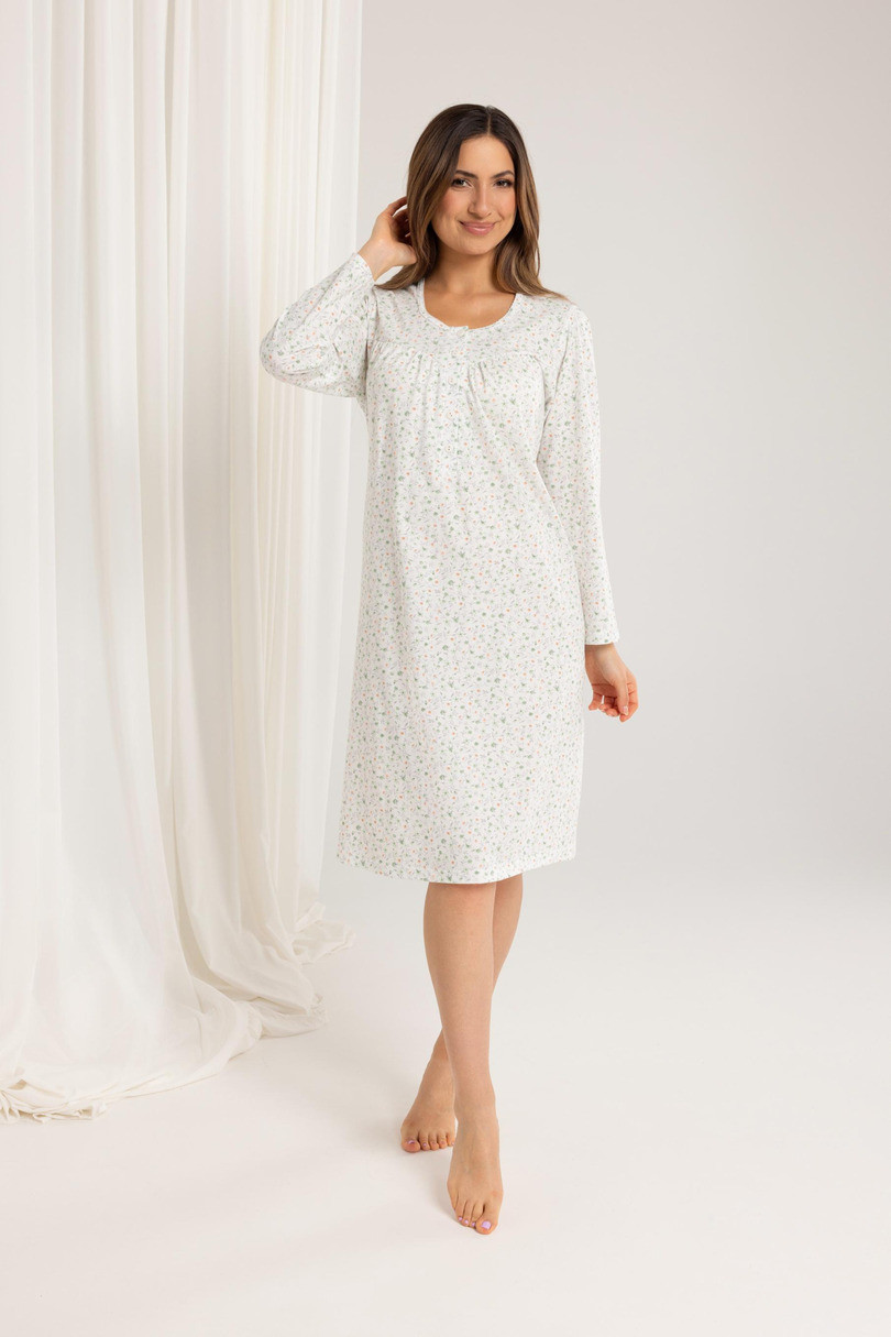 Dámska nočná košeľa 015 BIG J/25 - jemná bavlna a klasická elegancia Nočná košeľa 015 BIG J/25 je elegantný a funkčný model vyrobený z kvalitnej vzorovanej bavlny. Mäkký a priedušný materiál zaručuje pohodlie a klasický strih je ideálny na spánok aj domáci relax. Nočná košeľa má dlhé rukávy a jemne nariasený výstrih so zapínaním na gombíky - vďaka tomu je praktickou voľbou aj pre dojčiace matky. Dĺžka po kolená poskytuje väčšie pohodlie a ochranu počas chladnejších večerov.