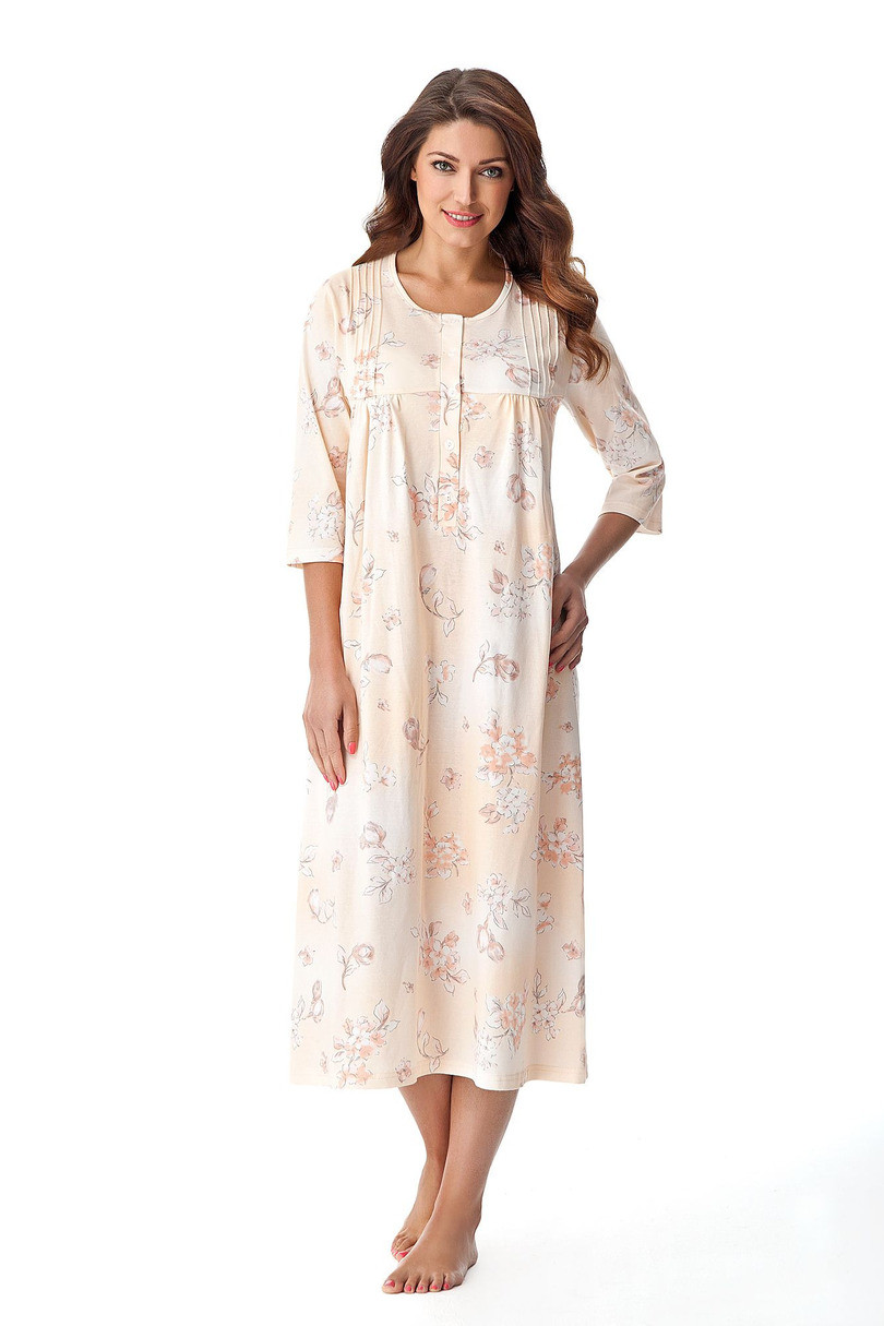 Dámska košeľa z jemnej vzorovanej bavlny. Krátke rukávy, mierne naberaný výstrih, zapínanie na gombíky, dĺžka po kolená. Materiál: 100% bavlna .