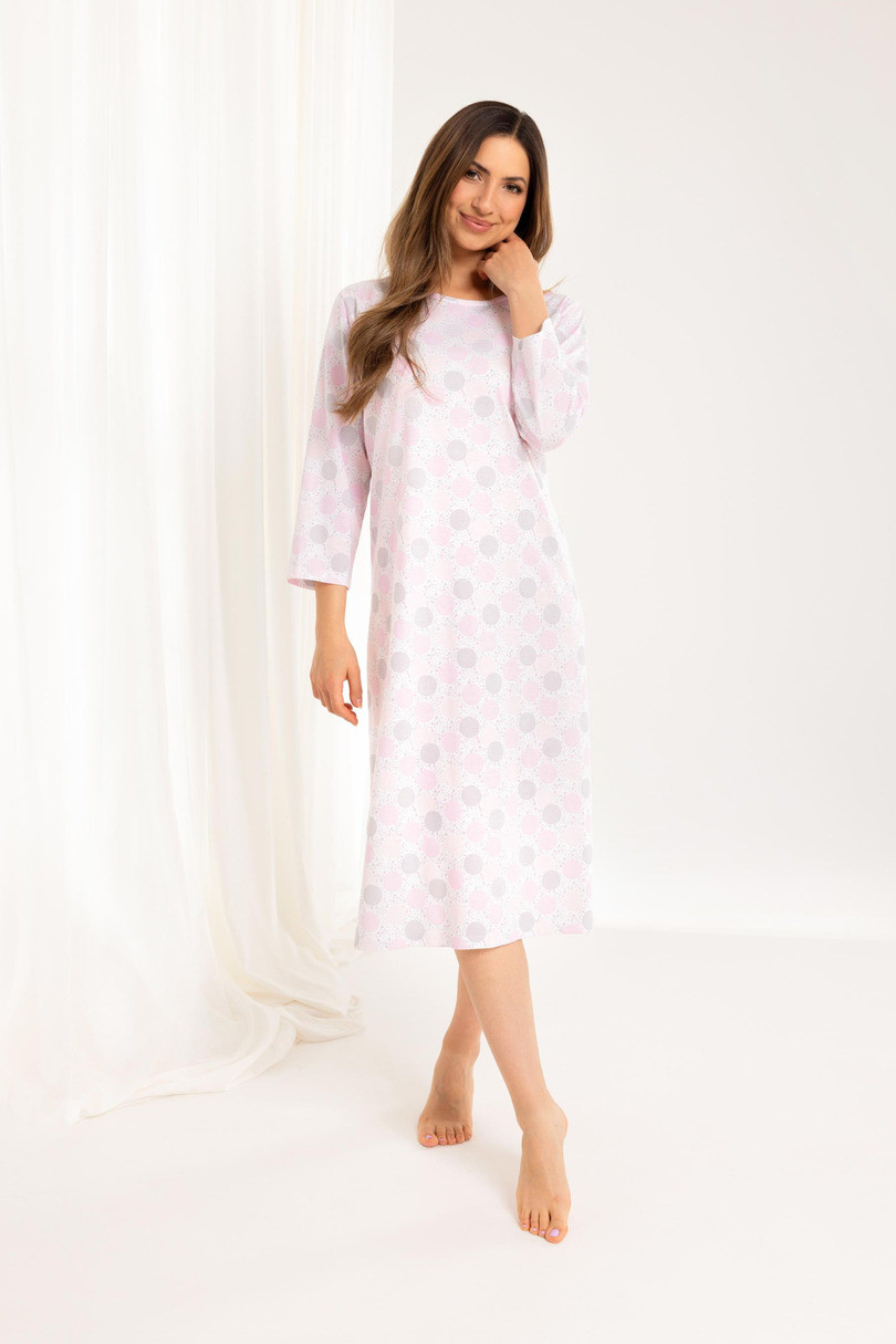 Dámska nočná košeľa 161 J/25 - klasika s očarujúcim bodkovaným vzorom Nočná košeľa 161 J/25 je ideálnou voľbou pre ženy, ktoré hľadajú pohodlie, prírodné materiály a jemný dizajn. Je vyrobená z vysokokvalitnej 100 % bavlny s pôvabnými bodkami a zaručuje pohodlie a priedušnosť počas celej noci. Model má 7/8 rukávy, okrúhly výstrih a dĺžku po kolená - ideálna voľba na každé ročné obdobie. Vďaka klasickému strihu a jemnému vzoru je košeľa vhodná na nočnú bielizeň aj na ľahké domáce nosenie.