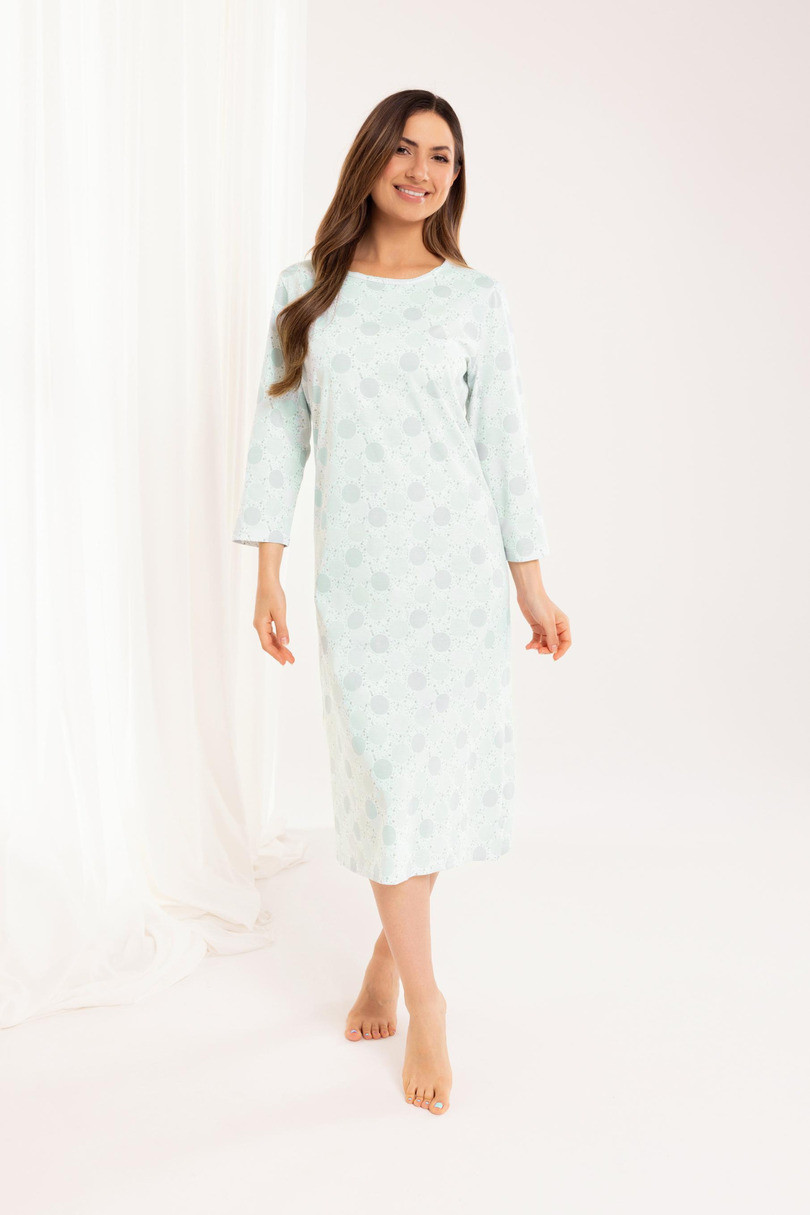 Dámska nočná košeľa 161 J/25 - klasika s očarujúcim bodkovaným vzorom Nočná košeľa 161 J/25 je ideálnou voľbou pre ženy, ktoré hľadajú pohodlie, prírodné materiály a jemný dizajn. Je vyrobená z vysokokvalitnej 100 % bavlny s pôvabnými bodkami a zaručuje pohodlie a priedušnosť počas celej noci. Model má 7/8 rukávy, okrúhly výstrih a dĺžku po kolená - ideálna voľba na každé ročné obdobie. Vďaka klasickému strihu a jemnému vzoru je košeľa vhodná na nočnú bielizeň aj na ľahké domáce nosenie.