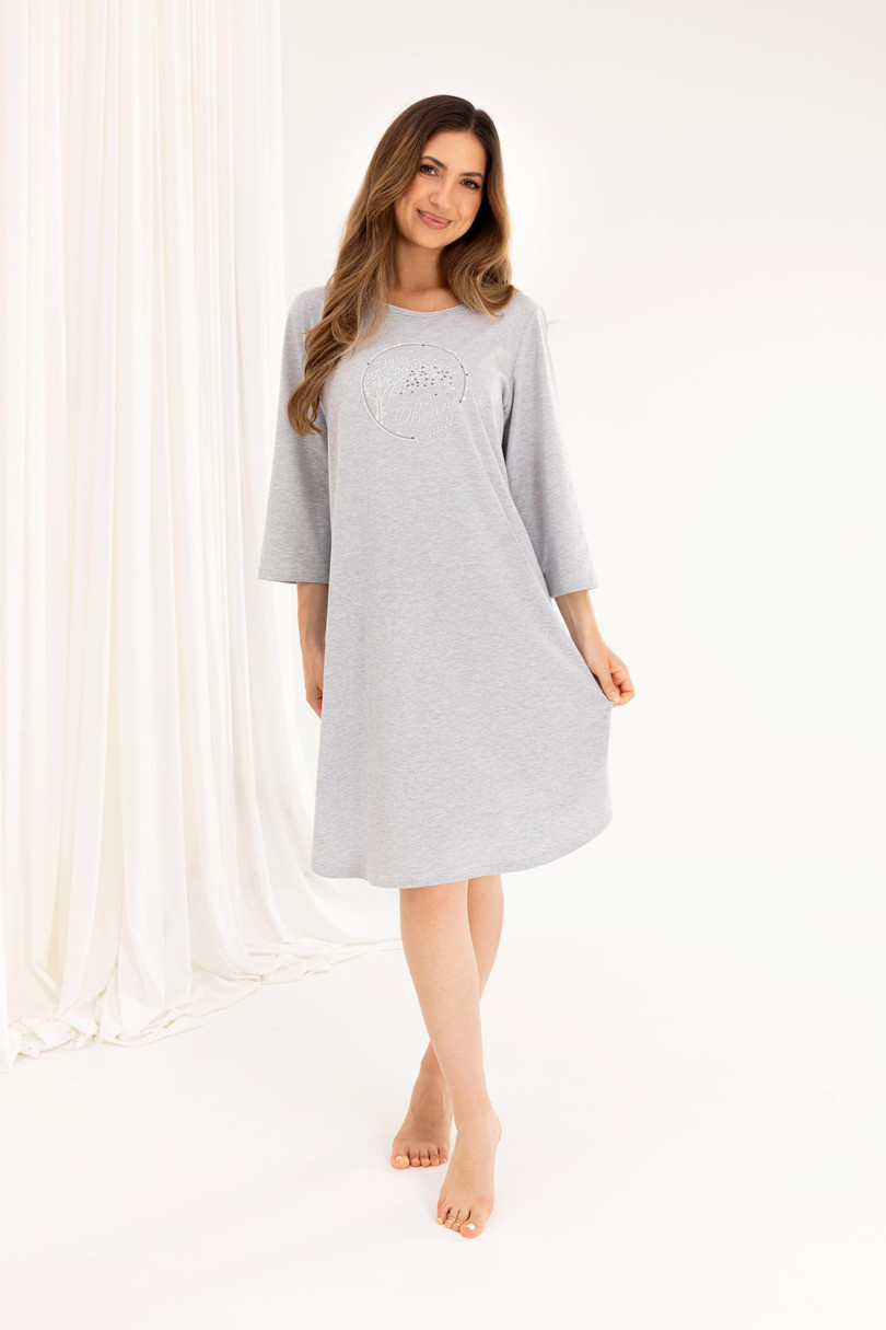 Dámska nočná košeľa 167 J/25 - ženský tvar a prirodzené pohodlie Nočná košeľa 167 J/25 je dokonalou kombináciou klasického strihu a jemného pôvabu. Je vyrobená zo 100 % vysokokvalitnej bavlny a zaručuje pohodlie a priedušnosť počas celej noci. Má 3/4 rukávy a polkruhový výstrih a prednú stranu zdobí jemná potlač. Mierne rozšírený strih smerom k spodnej časti krásne sedí na postave a zaručuje voľnosť pohybu. Vďaka dĺžke pred kolená je košeľa praktická na teplejšie aj chladnejšie noci.