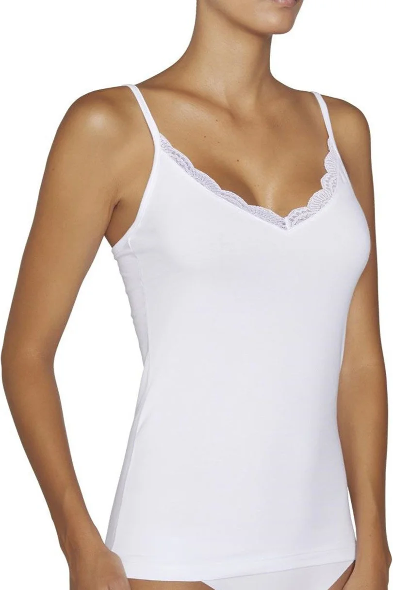 Dámska košieľka s tenkými nastaviteľnými ramienkami.Vrchná časť zdobená jemnou čipkou. Zloženie: 95 % bavlna, 5 % elastan.