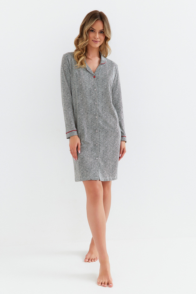 Dámska košeľa Cana 409 s rozopnutými gombíkmi materiál - jednoduchý džersej, 100% bavlna vzor rybej kosti v grafitovej farbe košeľa bez zapínania s golierom dlhý rukáv červené lemy klasický strih do pása dĺžka po kolená