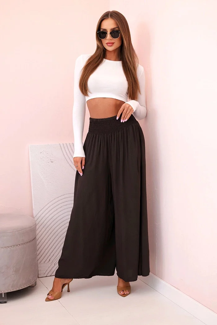 Ak hľadáte pohodlné a štýlové nohavice na každý deň alebo na dovolenku, tieto dámske palazzo nohavice sú hitom! Sú vyrobené zo 100 % ľahkej, vzdušnej viskózy a poskytujú nielen pohodlie pri nosení, ale aj krásne sedia na postave. Široké nohavice a rozšírený strih dodajú každému pohybu ľahkosť a eleganciu a elastický pás sa dokonale prispôsobí pásu. Perfektne sa hodia na prechádzku, nákupy alebo na pláž - stačí pridať jednoduchý top a je to! Univerzálny model, ktorý by nemal chýbať vo vašom šatníku. Veľkosť je univerzálna a hodí sa pre ženy vo veľkosti S, M alebo L. Vlastnosti výrobku: - Vhodný na nosenie v šatách, ktoré sa dajú nosiť v šatách: Strih: voľné palazzo nohavice Materiál: mäkká, ľahká viskóza Pohodlie: elastický pás, vzdušný materiál Funkčnosť: ľahko kombinovateľné, na rôzne príležitosti Ďalšie detaily: efektný pás Vyrobené v Taliansku Zloženie materiálu: Materiál: 100% bavlna: materiál: 100% viskóza Nižšie uvedené rozmery sú merané na plocho +/- 1 cmna zistenie obvodu vynásobte šírku dvomi Rozmery: Šírka v páse: 30 cm (po natiahnutí: 50 cm) Šírka v oblasti bokov: 61 cm Celková dĺžka: 95 cm Dĺžka od rozkroku: 61 cm Šírka nohavíc: 42 cm