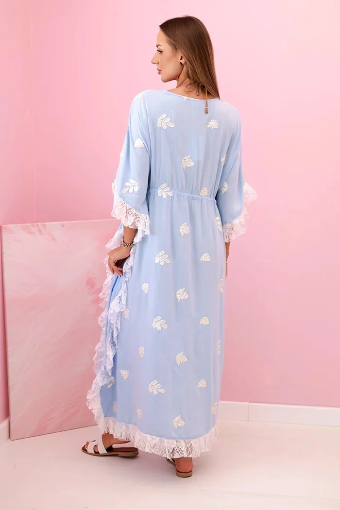 Tento štýlový dámsky overal v boho štýle je dokonalým doplnkom k letným outfitom. Je vyrobený zo 100 % ľahkej viskózy, krásne sedí na postave a poskytuje pohodlie počas celého dňa. Model očarí detailmi - zdobia ho mušle vo výstrihu, čipkové vsadky a jemná výšivka. Vďaka zaväzovaniu v páse sa overal dokonale prispôsobí postave a zvýrazní pás. Skvelý tip na pláž, letnú prechádzku alebo ako ľahký doplnok ku každodenným outfitom. Ľahko sa kombinuje so šatami, topom aj šortkami. Univerzálna veľkosť vhodná pre ženy nosiace veľkosť S, M alebo L. Vlastnosti výrobku: - je vhodný na nosenie v šatách, ktoré sa dajú nosiť v šatke: Strih: dlhý, voľný, so zaväzovaním v páse Výstrih: výstrih do V s ozdobnými vrúbkami Materiál: ľahká, priedušná viskóza Štýl: boho, letný, ležérny Doplnky: čipka, výšivka, mušle Pohodlie: mäkký a príjemný materiál Funkčnosť: ideálny ako ľahký prehoz na posteľ Vyrobené v Indii Zloženie materiálu: - kožušiny, - kožušiny, - kožušiny, - kožušiny: materiál: 100 % viskóza Nižšie uvedené rozmery sú merané na plocho +/- 1 cm Šírku vynásobte 2, aby ste získali obvod Rozmery: Šírka v páse: 52 cm Celková dĺžka: 129 cm