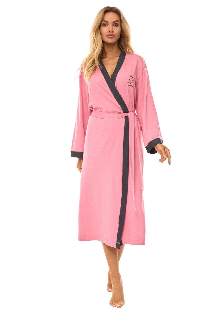 Tento dámsky dlhý župan v sebe spája jemnosť, pohodlie a sofistikovaný štýl. Je vyrobený z vysokokvalitného jemného viskózového úpletu, ponúka maximálne pohodlie pri nosení a ľahký materiál, ktorý sa dokonale prispôsobí postave. Kontrastné manžety a polodupačky dodávajú moderný nádych, zatiaľ čo jemná výšivka na hrudi zvýrazňuje ženský detail. Dlhé rukávy, zaväzovanie v páse a praktické vrecká na bokoch robia z tohto modelu funkčné a elegantné riešenie na domáci relax, rána alebo večery. Ideálny ako darček. Zloženie: 100 % viskóza