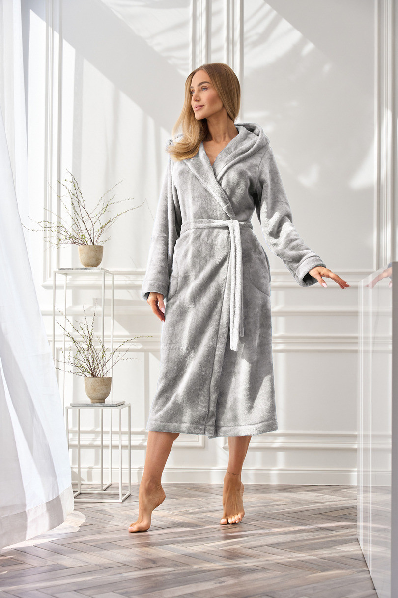 Dámsky dlhý župan L&L 2594 je ideálnou voľbou na chladné dni, pretože v sebe spája pohodlie, teplo a praktický strih. Je vyrobený z výnimočne mäkkého a nadýchaného mäkkého úpletu zo 100 % polyesteru, dokonale obopína telo a poskytuje príjemný pocit tepla. Model je vybavený priestrannou kapucňou, ktorá chráni pred chladom, a pohodlnými vreckami na úrovni bokov. Zaväzovanie v páse umožňuje prispôsobiť si župan postave a zvýrazniť tak svoj pás. Maxi dĺžka dodáva županu eleganciu a je ideálny na rannú kávu aj na večerné relaxovanie doma.