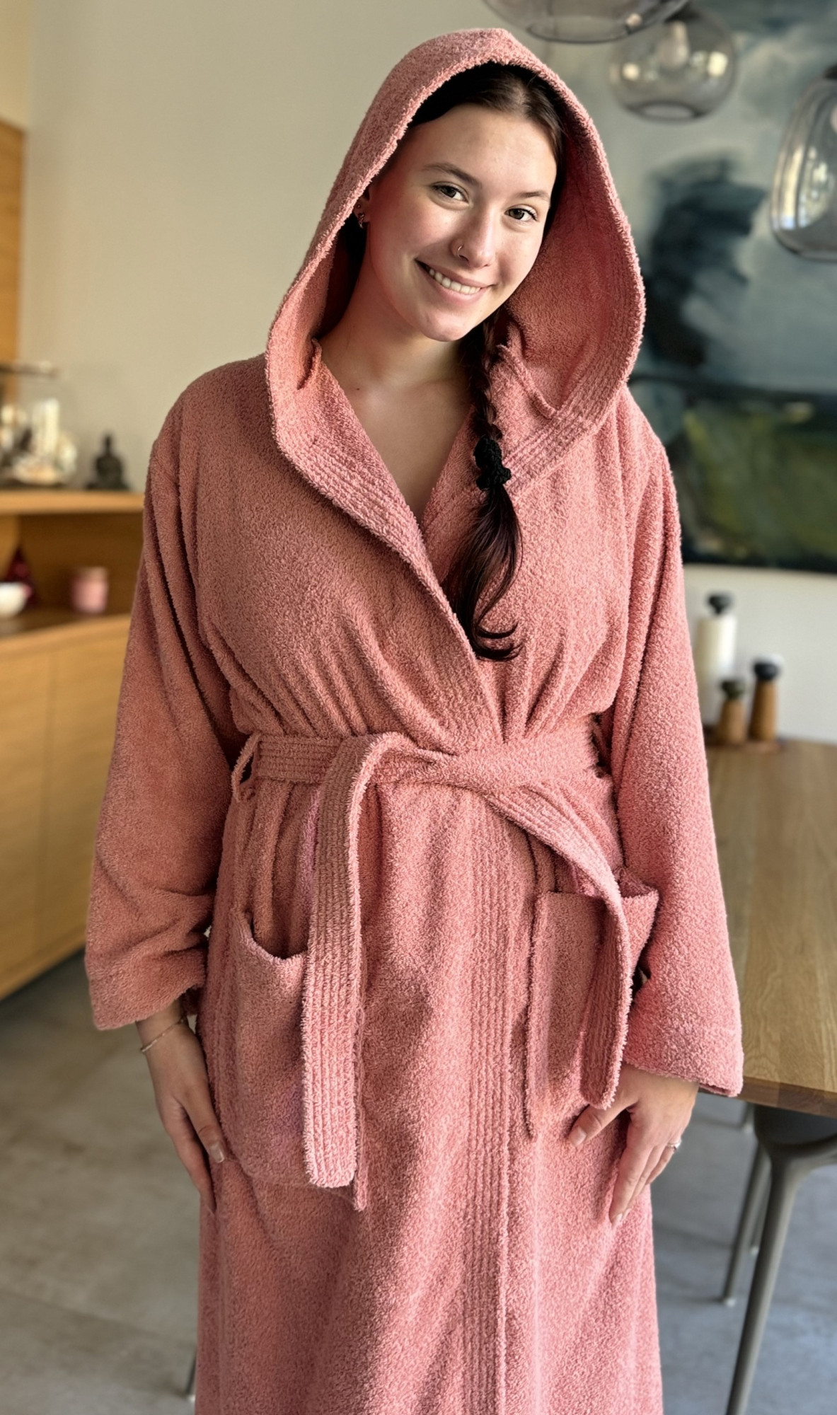 Dámský bavlněný froté župan s kapucí Broskev. Dámský dlouhý župan s kapucí a páskem ke stažení je vhodný po koupeli i na povalování se doma na gauči. Froté župan má praktické kapsy, které oceníte při návštěvě wellness. Použitý bavlněný materiál je příjemný a poddajný na dotek. Pokyny pro údržbu: - 100% bavlna- lze prát v pračce při teplotě do 30°- nesušit v sušičce- žehlit z rubu do 110°- nepoužívat bělící prostředky- nečistit chemicky Míry naměřené na výrobku: 1617410001 Broskev M L XL obvod 116 120 124 délka županu 120 120 120 délka rukávu (od ramene) 53 56 58