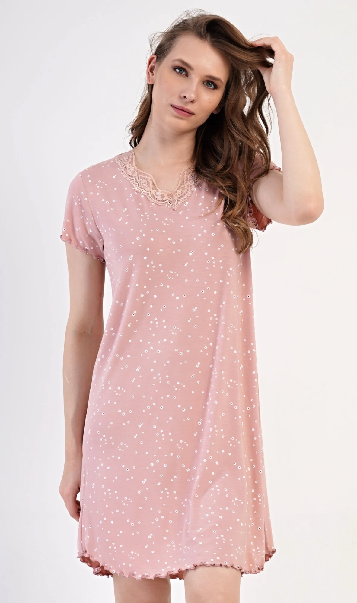 Dámská noční košile s krátkým rukávem Judita. Noční košile má příjemnou délkou nad kolena a ozdobné žlábkování okolo rukávů a spodního lemu. Výstřih je ozvláštněn jemnou krajkou. Košile s krátkým rukávem je potištěna drobnými kvítky. Použitý materiál ze směsi viskózy a lycry je příjemný a poddajný na dotek. Pokyny pro údržbu: - 95% viskoza, 5% lycra - lze prát v pračce při teplotě do 30°- nesušit v sušičce- žehlit z rubu do 110°- nepoužívat bělící prostředky- nečistit chemicky Míry naměřené na výrobku: 4092960841 Judita 1XL 2XL 3XL 4XL obvod hrudníku 108 112 116 120 obvod boky 118 120 124 128 délka 88 89 90 91