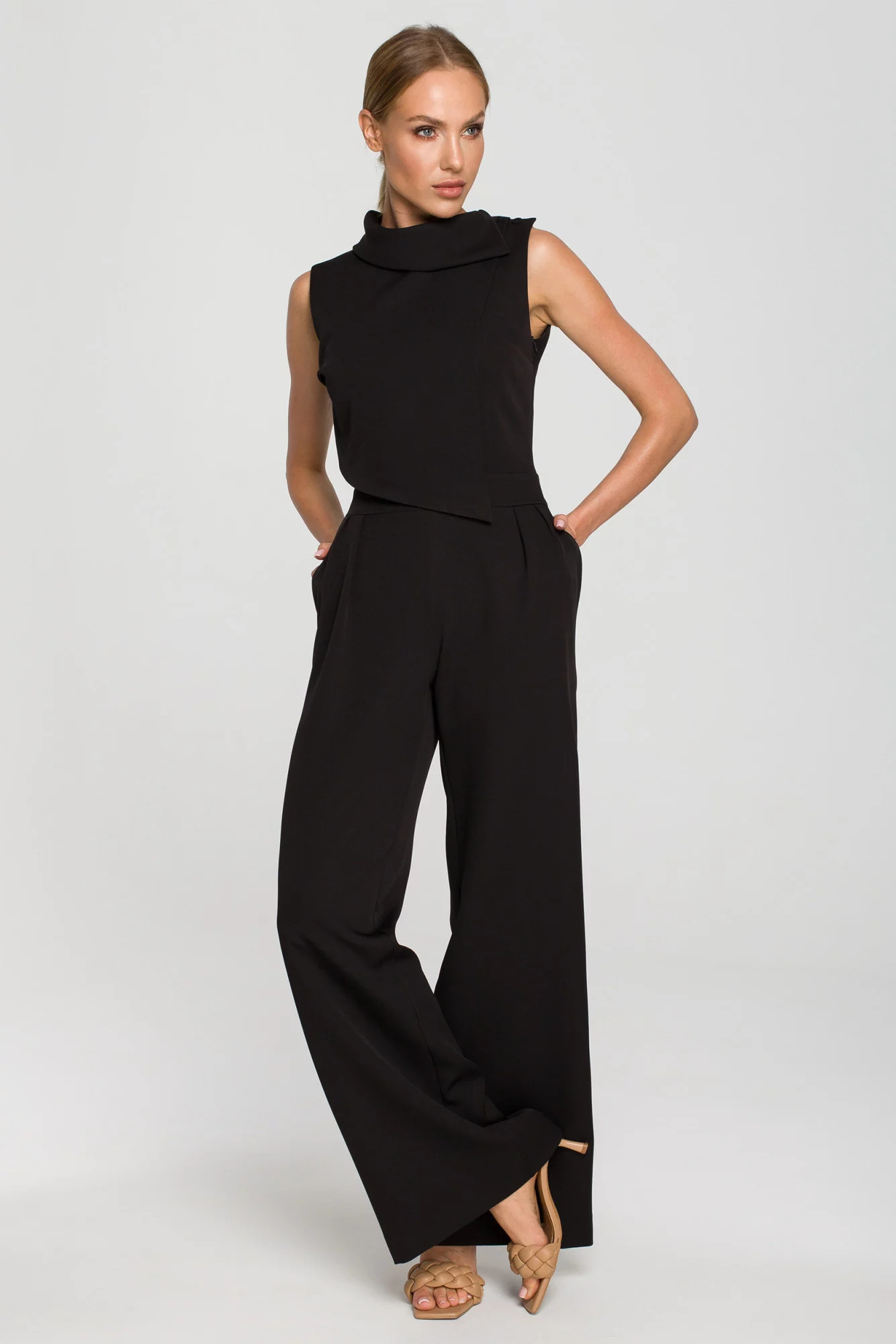 Buďte jedinečná, keď si vyberiete tento originálny overal so širokými nohavicami a ozdobným dvojvrstvovým zvrškom bez rukávov s vysokým golierom a krásnym zapínaním na ramenách.Zloženie materiálu: 95% polyester, 5% elastanKategóriaFC: Dámske oblečenie | OveralyKolekcia: Jar/Jeseň/ZimaPohlavie: DámskePokyny týkajúce sa starostlivosti: Pokyny na pranie: 30°C Možno prať v práčkeFarba: Čierna