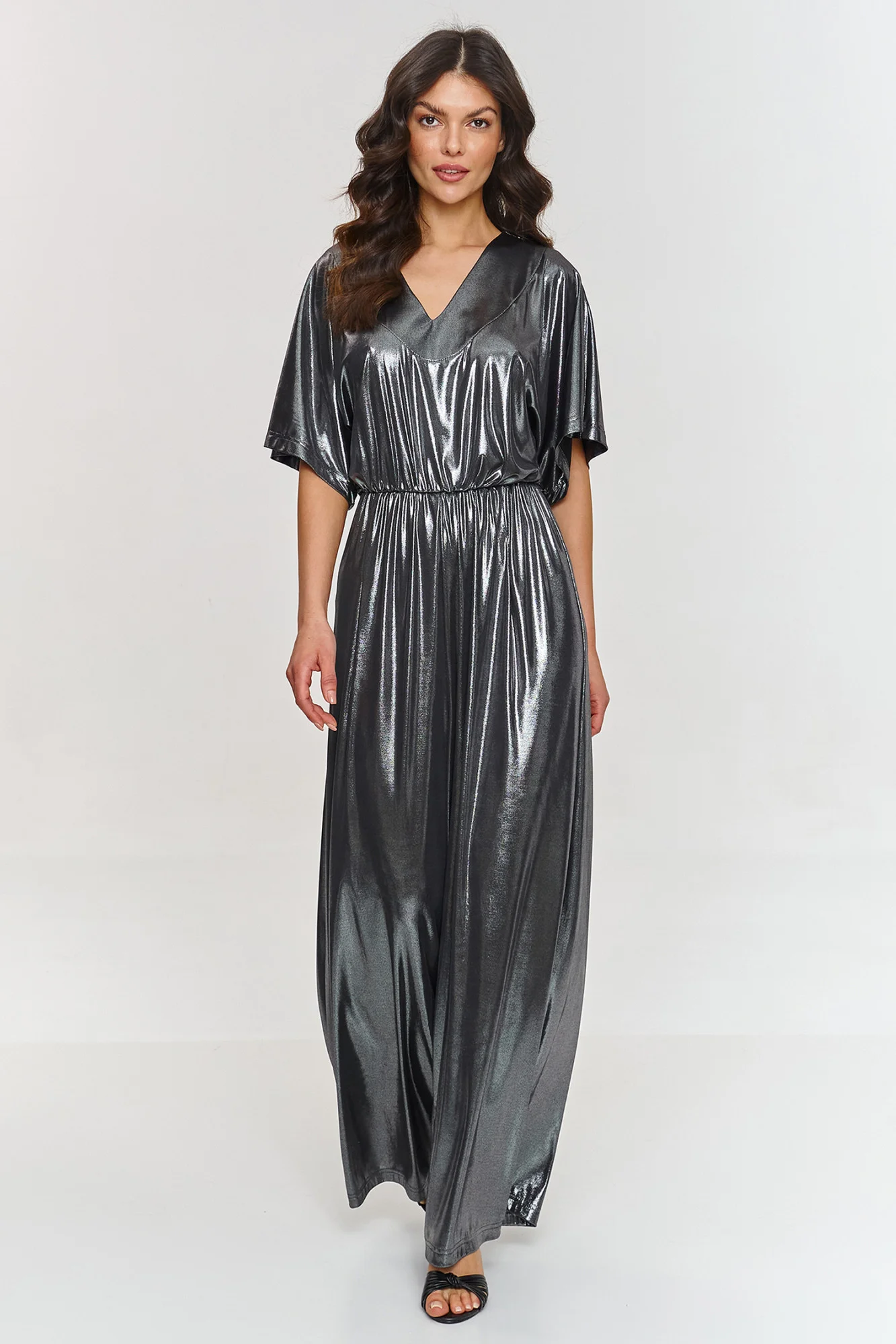 Tento overal je kombinací elegance a pohodlí, která jistě přitáhne pozornost na každé speciální události. Volný vrch s rukávy v kimono stylu mu dodává lehkosti a volnosti. Tento detail dělá outfit vypadat výjimečně a stylově, zároveň neomezujíc pohyb. Výstřih do srdce je decentní a elegantní, skvěle zdůrazňuje krk a ramena. Tento střih výstřihu přidává smyslnost a zdůrazňuje ženskou siluetu, zachovávajíce přitom klasický, elegantní vzhled. Široké nohavice dávají overalu lehkost a zároveň zakrývají nedokonalosti postavy a umožní prodloužit siluetu. Elastický pas v pasu zaručuje přizpůsobení a zdůraznění figury, vytvářejíc efekt vydřeného pasu. Díky tomu se overal nejen stylově, ale i pohodlně prezentuje po celý den nebo večer. Model je vyroben z jemného materiálu s kovovým zpracováním, dodávající outfitu výjimečný lesk a moderní charakter. Overal v kovové barvě s výstřihem do srdce je návrh, který tě vystaví z davu. J elastan 7% Polyester 93% Veľkosť DĺžkaObvod bokov Obvod hrudníka Obvod pása 36150 cm104 cm104 cm96 cm38152 cm108 cm108 cm100 cm40154 cm112 cm112 cm104 cm42156 cm116 cm116 cm108 cm