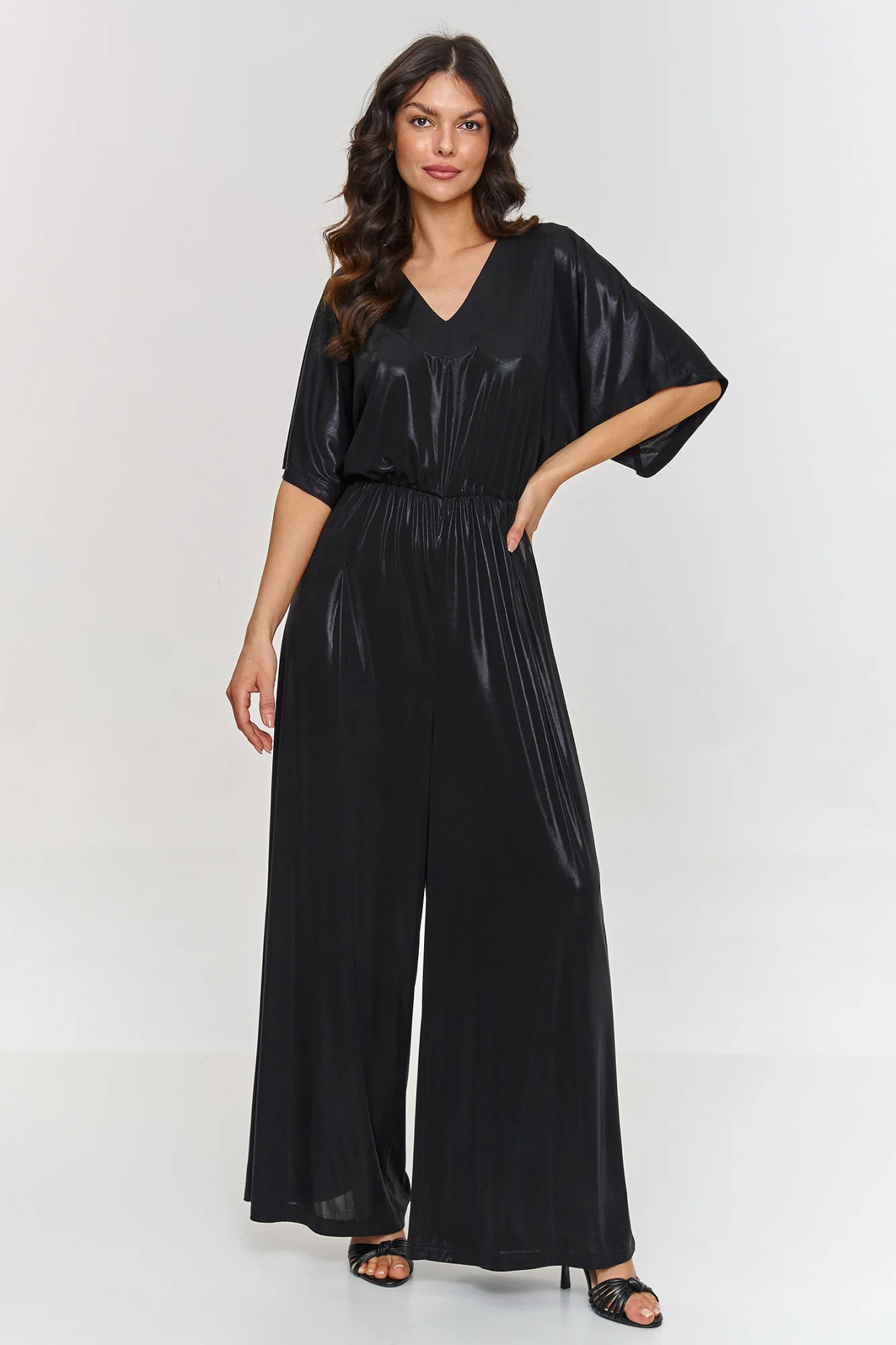 Tento overal je kombinací elegance a pohodlí, která jistě přitáhne pozornost na každé speciální události. Volný vrch s kimono rukávy dodává lehkost a volnost. Tento detail dělá outfit vypadat výjimečně a stylově, zároveň neomezuje pohyb. Výstřih do "V" je decentní a elegantní, skvěle zdůrazňuje krk a ramena. Tento střih výstřihu přidává smyslnost a zdůrazňuje ženskou siluetu, zachovává přitom klasický a elegantní vzhled. Široké nohavice dodávají overalu lehkost a zároveň zakrývají nedokonalosti postavy a umožní prodloužit siluetu. Elastický pas v pasu zaručuje přizpůsobení a zdůraznění postavy, vytváří efekt přesýpacích hodin. Díky tomu se overal nejen stylově, ale i pohodlně prezentuje po celý den či večer. Model je vyroben z jemného materiálu s metalickým povrchem, který outfitu dodává výjimečný lesk a moderní charakter. Overal v metalické barvě s výstřihem do "V" je návrh, který vás vynese z davu. Jeho moderní stř elastan 7% Polyester 93% Veľkosť DĺžkaObvod bokov Obvod hrudníka Obvod pása 36150 cm104 cm104 cm96 cm38152 cm108 cm108 cm100 cm40154 cm112 cm112 cm104 cm42156 cm116 cm116 cm108 cm