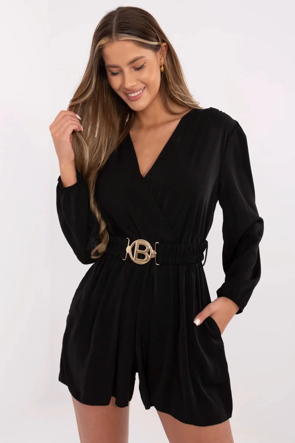 Tento krátky dámsky overal je kombináciou elegancie a pohodlia, ktorá je ideálna na mnohé príležitosti: od každodenných vychádzok až po obchodné stretnutia a večerné večierky. Je vyrobený z príjemného materiálu (polyester, viskóza, elastan), dobre sedí a poskytuje voľnosť pohybu. Zavinovací výstrih dodáva modelu ženský šarm, zatiaľ čo dlhé rukávy zaručujú, že je vhodný aj na chladnejšie dni. Hladký materiál a opasok v páse krásne zvýrazňujú postavu. Štýlová a praktická voľba na mnohé príležitosti. elastan 5% Polyester 50% Viskóza 45% Veľkosť DĺžkaObvod pása Obvod cez prsia Obvod pása univerzálny81 cm134 cm106 cm58-120 cm