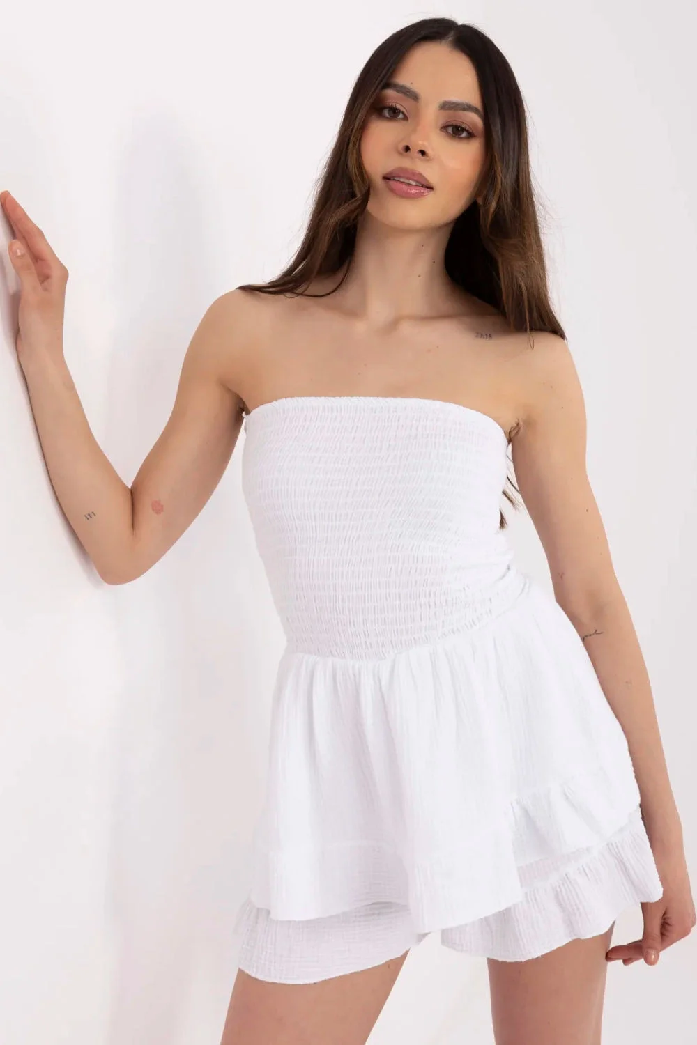 Tento elegantný dámsky overal je ideálny na každodenné nosenie a spája pohodlie s módnym vzhľadom. Je vyrobený z mäkkej bavlny, ktorá poskytuje pohodlie počas celého dňa. Krátke nohavice a strih bez rukávov robia z tohto kúsku skvelú voľbu na teplé dni. Overal sa vyznačuje jednoduchým, hladkým vzorom, ktorý zdôrazňuje minimalistický charakter oblečenia. Ozdoba v hornej časti a volánik na spodnom okraji dodávajú celku ľahkosť a jemnú ženskosť. Konštrukcia bez gombíkov zaručuje pohodlné nosenie a jednoduché obliekanie. 100 %bavlna Veľkosť DĺžkaObvod pása Obvod cez prsia Obvod pása univerzálny65 cm110 cm58-128 cm56-122 cm