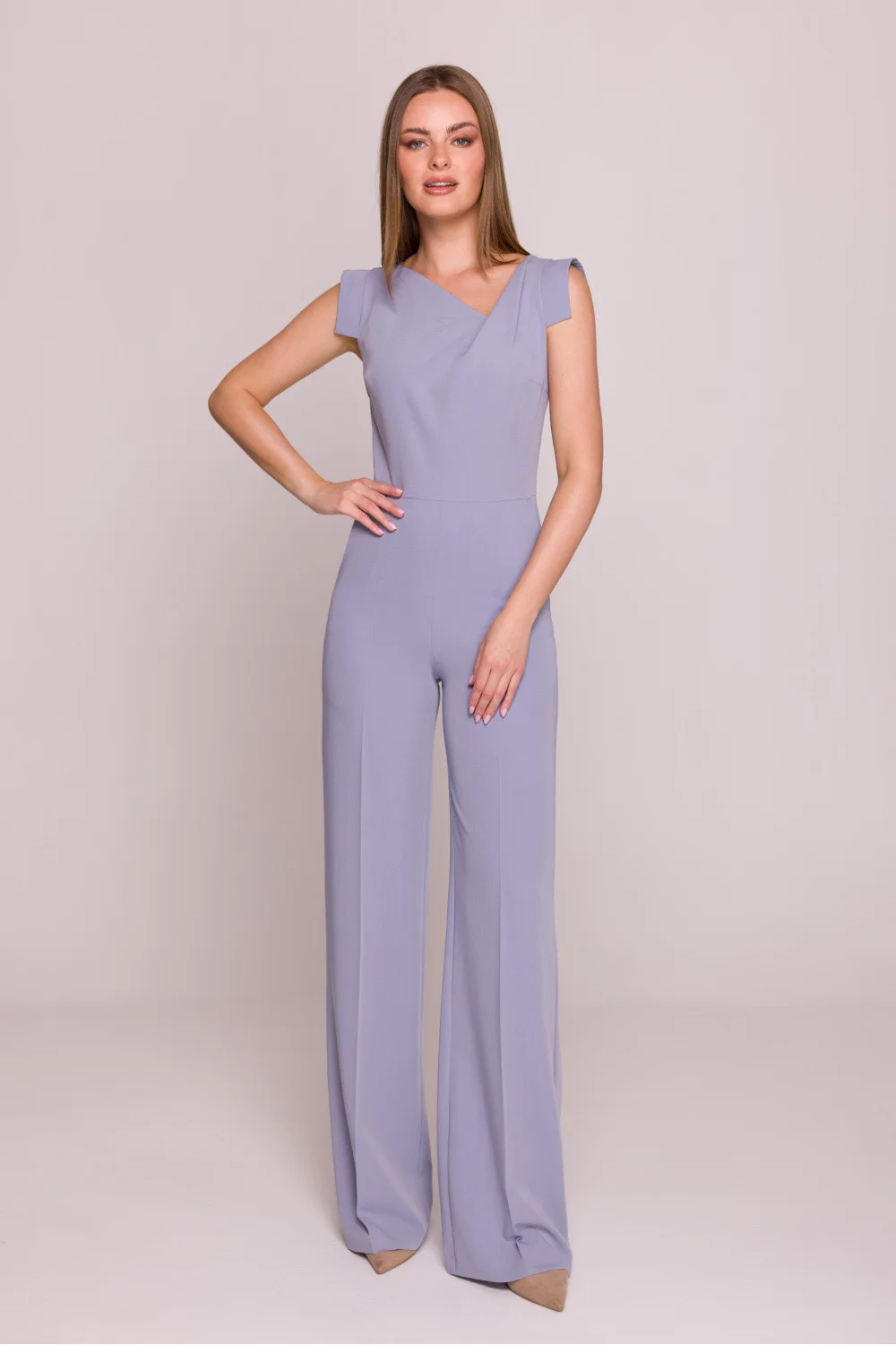 Moderný overal z hladkej, mierne elastickej tkaniny so saténovou úpravou, ktorá mu dodáva jemný lesk a eleganciu. Model bez rukávov s asymetrickým výstrihom zdobeným efektným záhybom, ktorý priťahuje pozornosť a zdôrazňuje jedinečný charakter oblečenia. Skryté zapínanie na zips na chrbte zaručuje pohodlie a nevtieravý vzhľad. Vrchná časť overalu je prispôsobená, s vysokým pásom, ktorý zvýrazňuje pás a dodáva siluete ženský tvar. Široké nohavice s preloženým lemom dodávajú štýl a zaručujú pohodlie pri nosení. Praktickým doplnkom sú bočné vrecká a vďaka absencii podšívky je overal ľahký a priedušný. Navrhnutý a ušitý v Poľsku. elastan 5% Polyester 65% Viskóza 30% Veľkosť DĺžkaObvod bokov Obvod hrudníka Obvod pása L153 cm100 cm94 cm82 cmM152 cm95 cm89 cm77 cmS151 cm90 cm84 cm72 cmXL154 cm105 cm99 cm87 cm