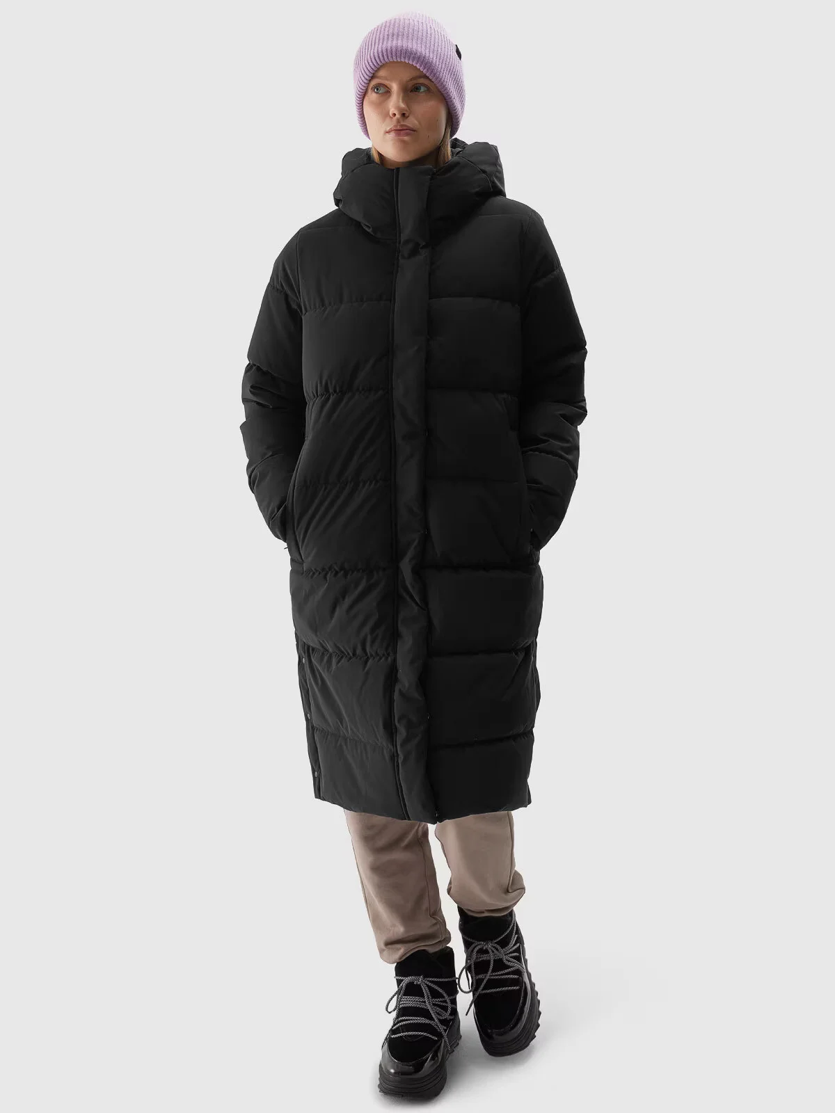 Dámsky zimný páperový kabát so zvýšeným objemom a hmotnosťou výplne je ideálnou voľbou pre chladné a zimné dni počas každodenných alebo športových aktivít. Zaručuje veľmi dobrú ochranu pri nízkych teplotách a zároveň plný komfort počas rôznych poveternostných podmienok. Bunda má klasické horizontálne šitie, ktoré pozostáva z paralelných pruhov prebiehajúcich naprieč bundou. Tento typ šitia zabezpečuje dobrú tepelnú izoláciu a dostatočnú kompresiu bundy. Má pravidelný strih, ktorý sa pohodlne prispôsobí telu, a dĺžku siahajúcu pod kolená na dodatočnú ochranu pred chladom.