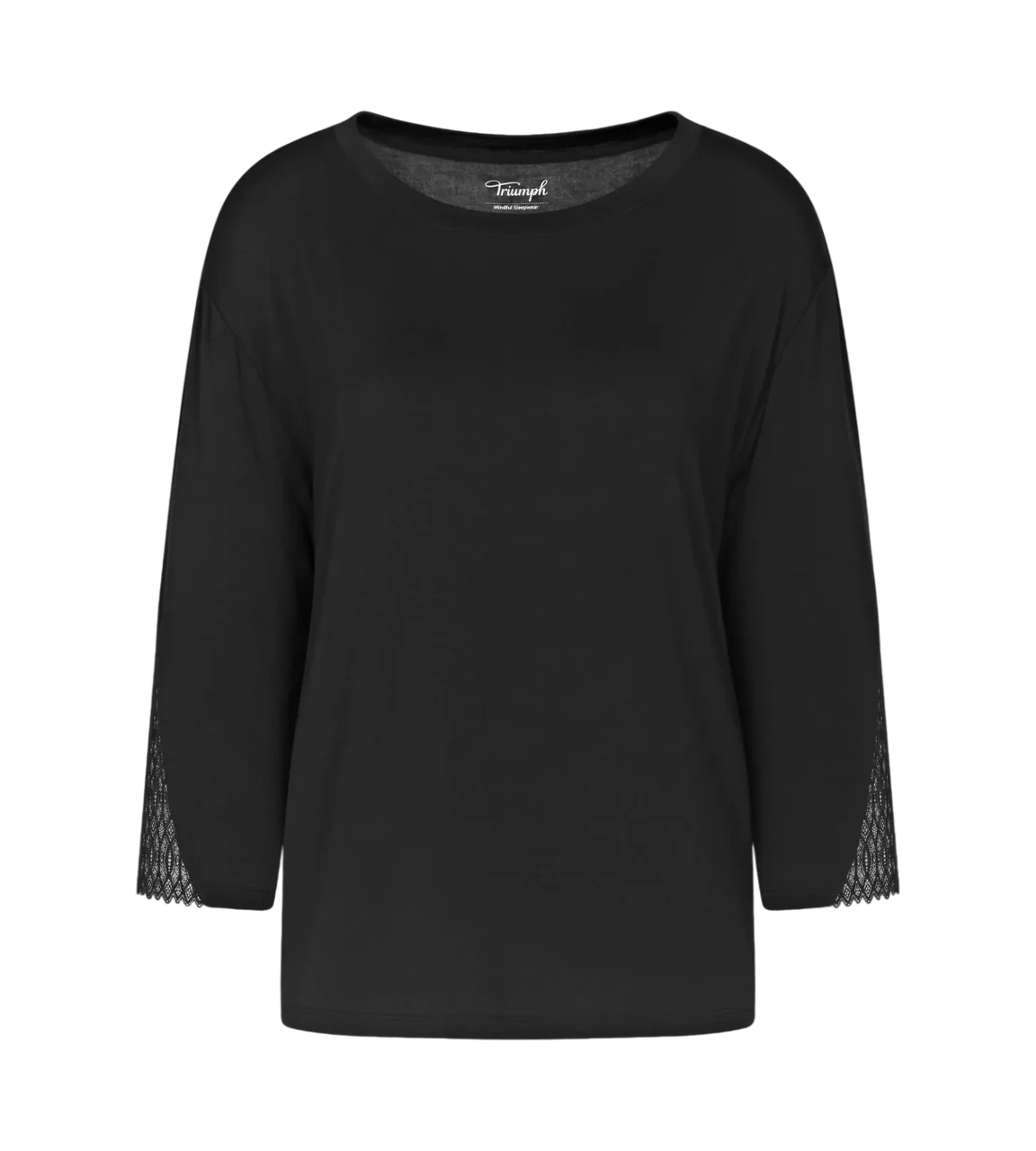 Vychutnajte si celoročnú eleganciu tohto modelu na obdobie medzi ročnými obdobiami. Tento základný kúsok nočnej bielizne, navrhnutý z výnimočne mäkkej tkaniny, je ideálny na teplejšie a chladnejšie noci. Pyžamový top s trojštvrťovým rukávom Jemné čipkované vsadky, ktoré dodávajú nádych elegancie Okrúhly výstrih, ktorý sa prispôsobí každej postave Pohodlná elastická tkanina Ľahko udržiavateľná tkanina, ktorá sa nemusí žehliť. OEKO-TEX® STANDARD 100, 93.0.3130 Hohenstein HTTI 94 % modalové viskózové vlákno, 6 % elastan