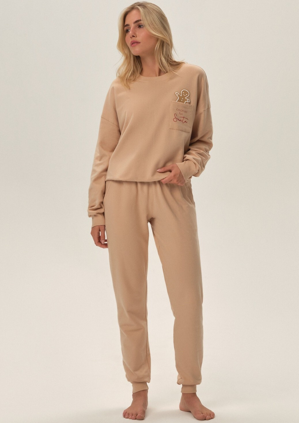 Dámska tepláková súprava od spoločnosti Henderson, vyrobená z mäkkej hladkej bavlny a zateplená z vnútornej strany. Mikina má dlhé rukávy s pleteným lemom, okrúhly výstrih a vrecko s vianočným motívom. Tepláková súprava je dlhá, na bokoch má vrecká a je zakončená pleteným lemom. Zloženie materiálu: 100 % bavlna