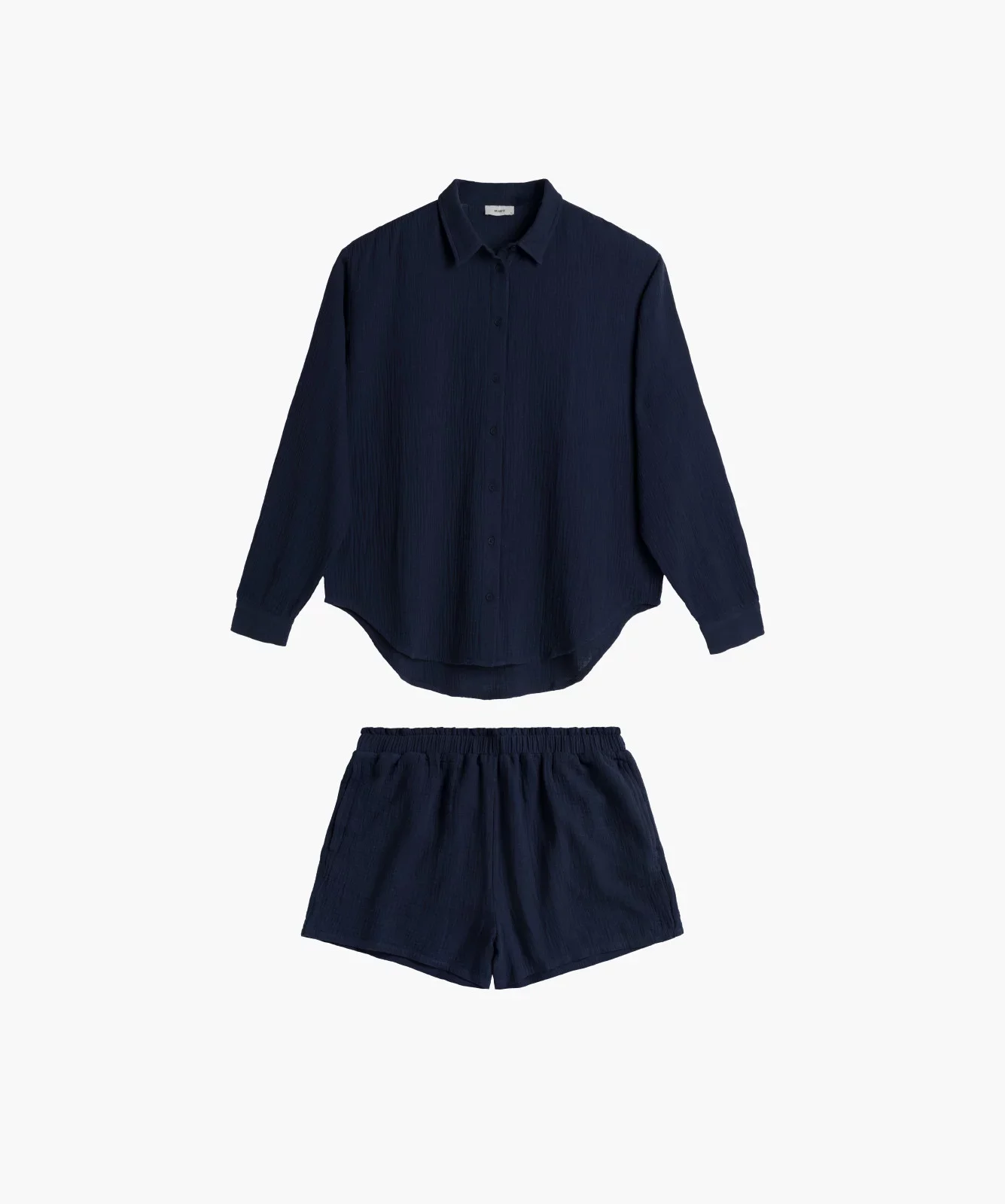 Dámsky set Muslin, Fashion collection - Domáce oblečenieDámsky set v tmavomodrej farbe je kombináciou blúzky nadrozmernej veľkosti a krátkych šortiek. Blúzka s golierom a dlhými rukávmi sa zapína na gombíky, zatiaľ čo šortky majú dve pohodlné vrecká na bokoch a sú zakončené šnúrkou v páse. Súprava je vyrobená z ľahkého a na dotyk príjemného mušelínu. 100 % bavlnený materiál je vzdušný, jemný a "priedušný" - v teplých dňoch poskytuje príjemný chládok. Očakávajte viacúčelový prvok šatníka a maximálne pohodlie. námornícka modráZELENÁ100% bavlna
