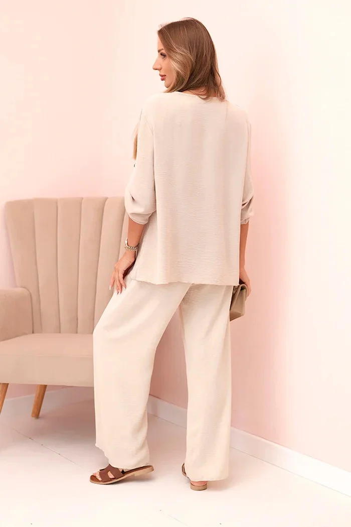 Dámsky set s blúzkou s náhrdelníkom a širokými nohavicami béžovej farby UNI