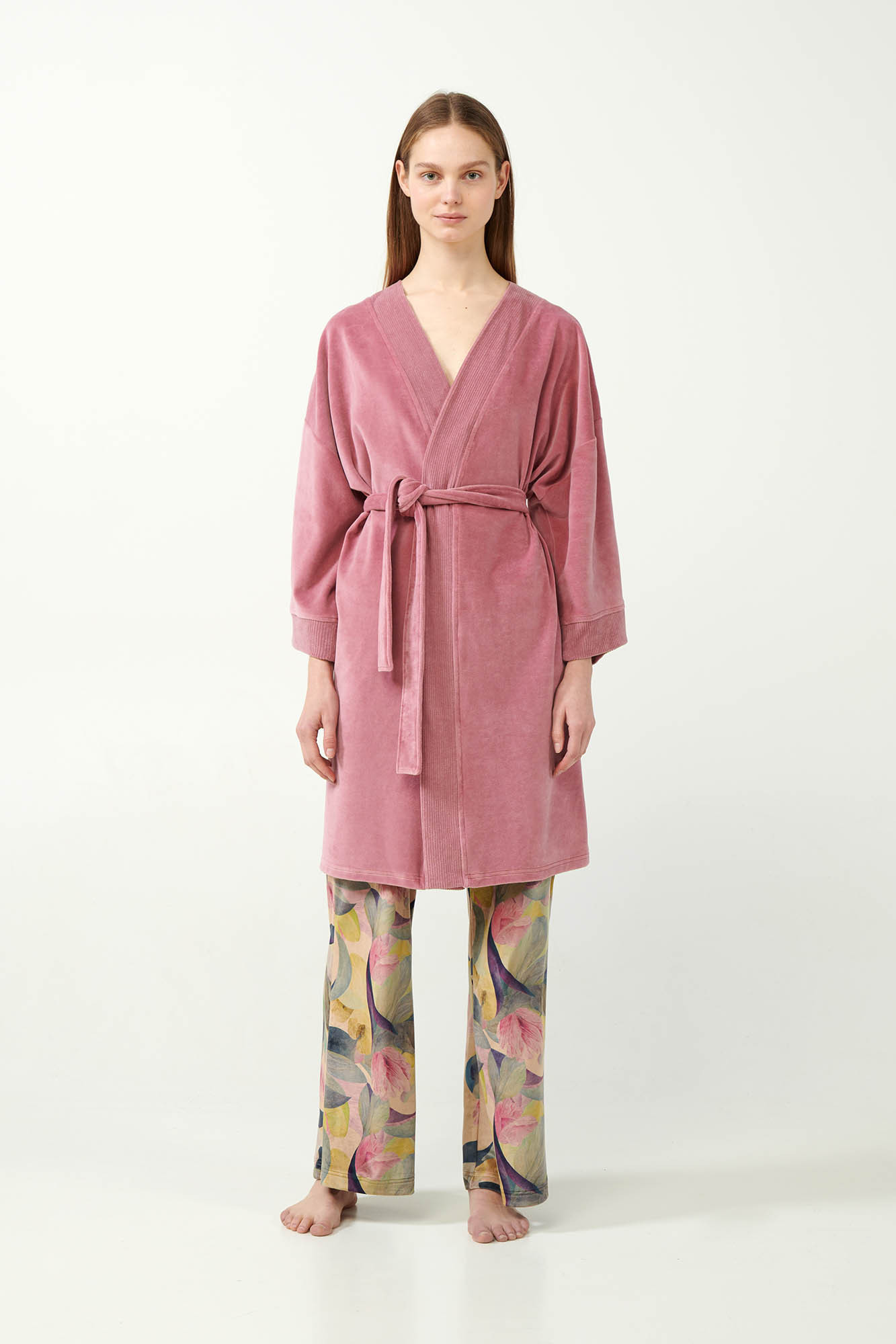 80% bavlna + 20% polyester Dĺžka: 100 cm. Model: výška 175 cm, veľkosť: Small. Zahaľte sa do luxusu s týmto dámskym županom, ktorý je vyrobený z mimoriadne mäkkého zamatu bohatého na bavlnu. Župan má klasický krížový dizajn, ktorý vám umožní prispôsobiť si strih pomocou vhodného pásu. Rebrovaný lem klopy dodáva eleganciu a pozdvihuje tento útulný základný kúsok. Tento župan je ideálny na štýlové leňošenie, ponúka pohodlie aj sofistikovanosť a je ideálnou voľbou na relaxáciu doma. Doprajte si teplo a mäkkosť a zároveň vyzerajte bez námahy elegantne.