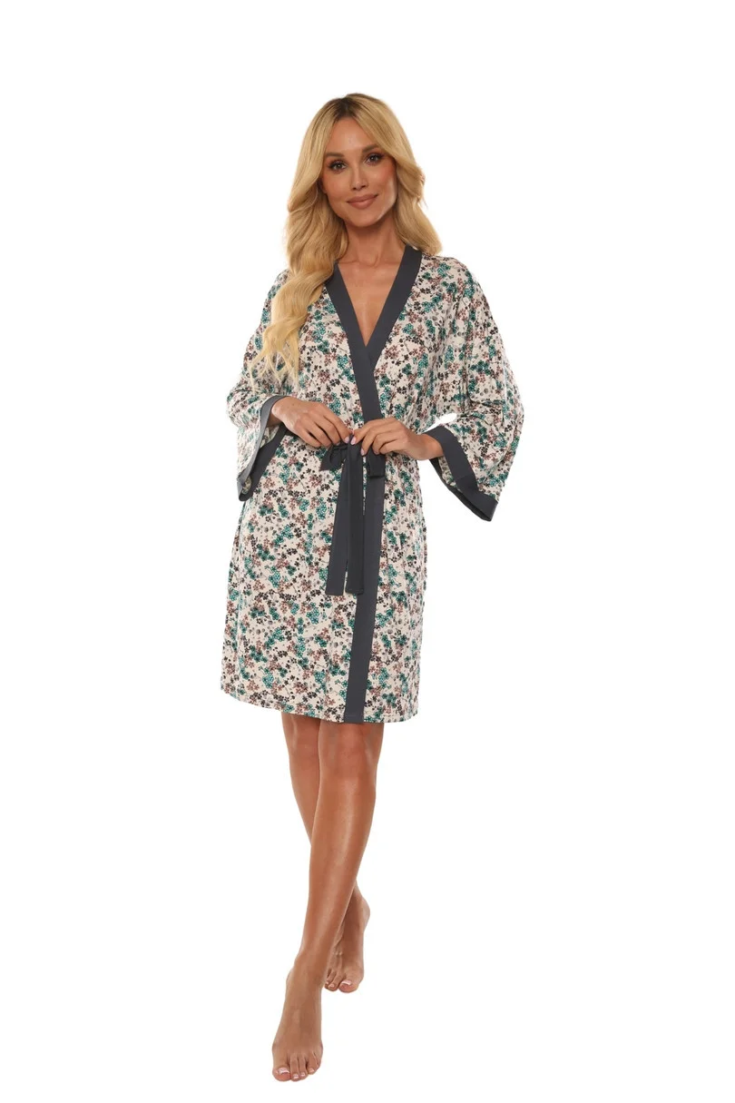 Tenký dámsky župan s rukávmi typu kimono. Ušitý z vzorovanej viskozy. V páse na zaviazanie. Na bokoch pohodlné vrecká. Zloženie: 94% viskóza, 6% elastan.
