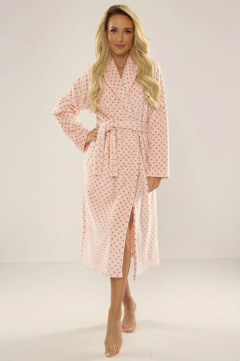 Dlhý dámsky župan, ktorý je vyrobený z bodkovanej tkaniny typu "soft". Župan má golier, vrecká a v páse sa zaväzuje. Zloženie: 100% polyester.