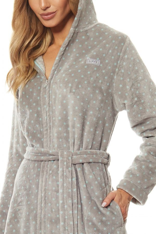 Dlhý a pohodlný dámsky župan - z mäkkého bodkovaného úpletu - s kapucňou - zips - jemná aplikácia na úrovni hrudníka - zaväzuje sa v páse - vrecká na bokoch Zloženie: 100 % polyester